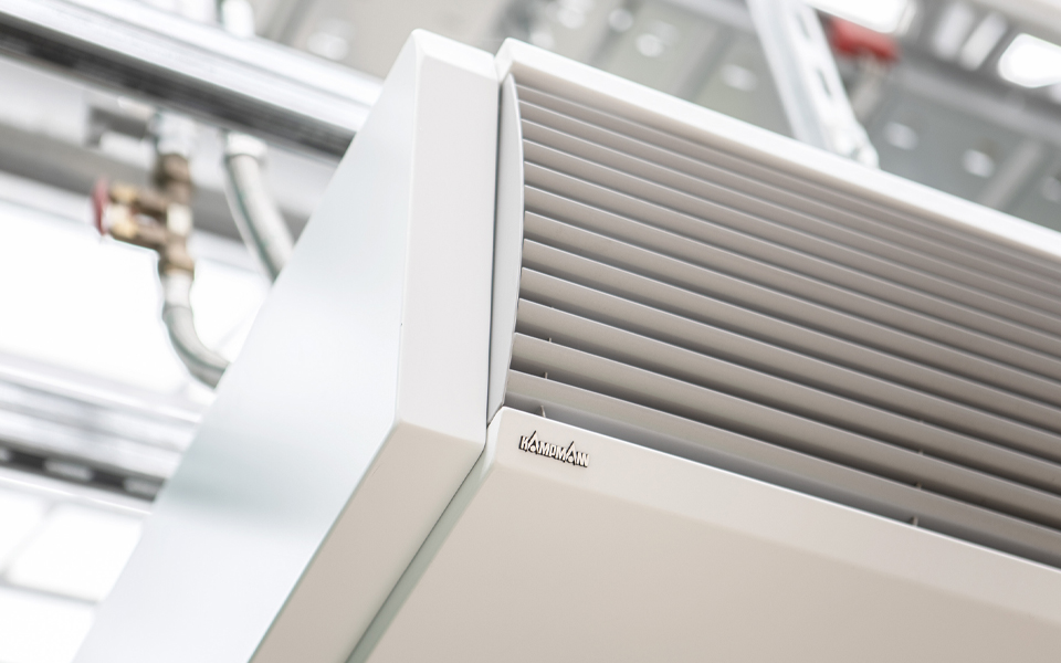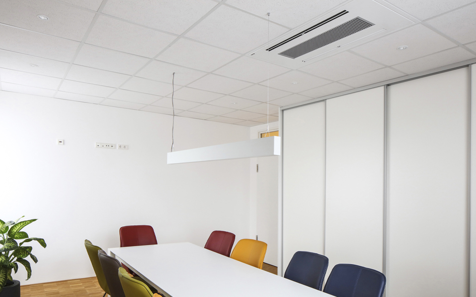 In Räumen mit einem längeren Aufenthalt von Menschen liegt der Fokus auf ein behagliches Wohlfühlklima mit angenehmen Temperaturen. Hier ist ein regelmäßiger Luftwechsel mit Frischluft sowie eine Konditionierung der Luft erforderlich. Je nach baulichen Voraussetzungen ist der Einsatz von FanCoils oder auch einer Deckenkassette möglich. In unserem Beispiel fiel die Wahl auf den FanCoil KaDeck. Das Deckengerät mit einer sehr geringen Bauhöhe von nur 165 mm vereint hochwertiges Design und Energieeffizienz durch den Einbau von EC-Querstromventilatoren. Die Konstruktion aus EPP (expandiertes Polypropylen), die deutlich an Gewicht einspart, sorgt für eine einfachere Montage und hat zudem schalldämpfende Eigenschaften. Die Desginblende fügt sich optimal in die Umgebung ein.