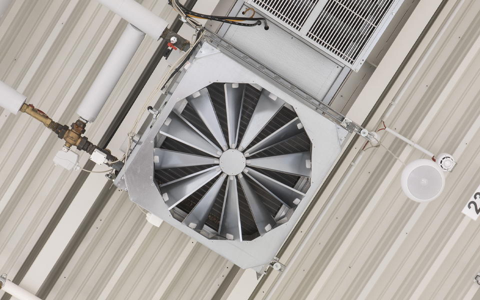 Im Lagerraum gibt es in der Regel keinen Bedarf für einen hygienischen Luftwechsel. Hier wird der Lufterhitzer TOP installiert um im Umluftbetrieb für ein gleichbleibendes Raumklima zu sorgen. Dabei saugt der Lufterhitzer die Umgebungsluft an und leitet sie durch den Wärmetauscher, wo sie erhitzt wird. Die EC-Ventilatoren sorgen dann für eine effiziente Luftführung. Der Lufterhitzer kann dabei von einer Wärmepumpe mit Pumpenwarmwasser im Niedertemperaturbereich versorgt werden und erreicht so eine maximale Energieeffizienz.