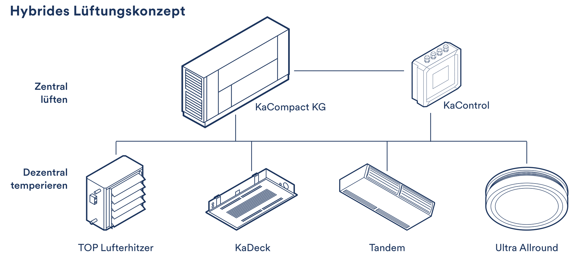 In einem hybriden System, der Verbindung von zentraler Lüftung und dezentraler Klimatisierung (Heizen und Kühlen über Pumpenwarmwasser und Pumpenkaltwasser), erfolgt der Luftwechsel über die zentrale Lüftungsanlage, wie z. B. dem KaCompact KG mit Wärmerückgewinnung. Das hybride System zeichnet sich durch viele Vorteile aus: