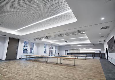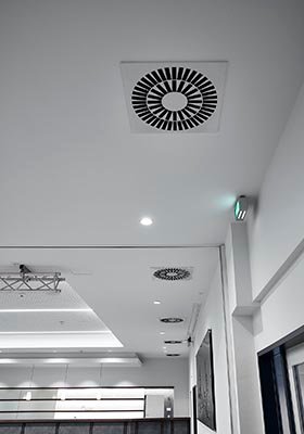 Im Inneren strömt die Luft hochinduktiv über acht DAL 359 Dralldurchlässe in den Raum. Die Luftführung entlang der Raumdecke und dann mit bereits stark reduzierter Luftgeschwindigkeit in den Saal hinab sorgt für eine zugfreie Belüftung. Maßgeblich dafür sind die sternförmig angeordneten Luftlenkelemente. Auf der gegenüberliegenden Raumseite befinden sich acht identische DAL Dralldurchlässe für die Abluft, die aus optischen Gründen mit denselben Luftlenkelementen ausgestattet sind.