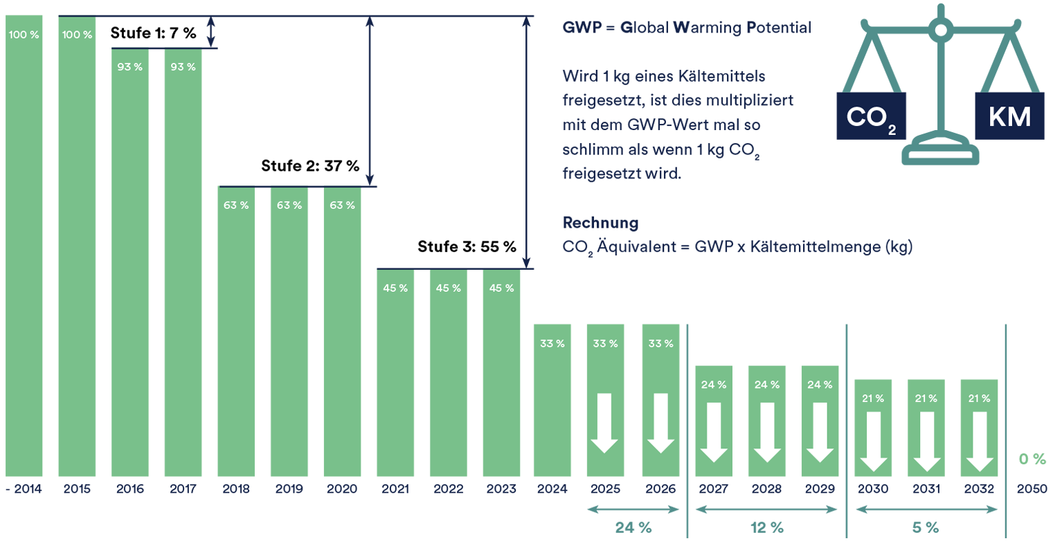 Hinzu kommen erweiterte Einsatzverbote für Kältemittel mit einem GWP über 150 und in Einzelbereichen über 750.