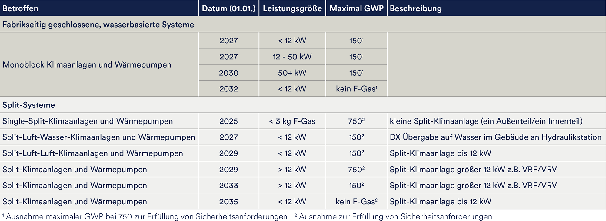 Verbot des Einsatzes von Frischware mit einem GWP über 750 für Klimaanlagen und Wärmepumpen (Ausnahme Kaltwassererzeuger) |
