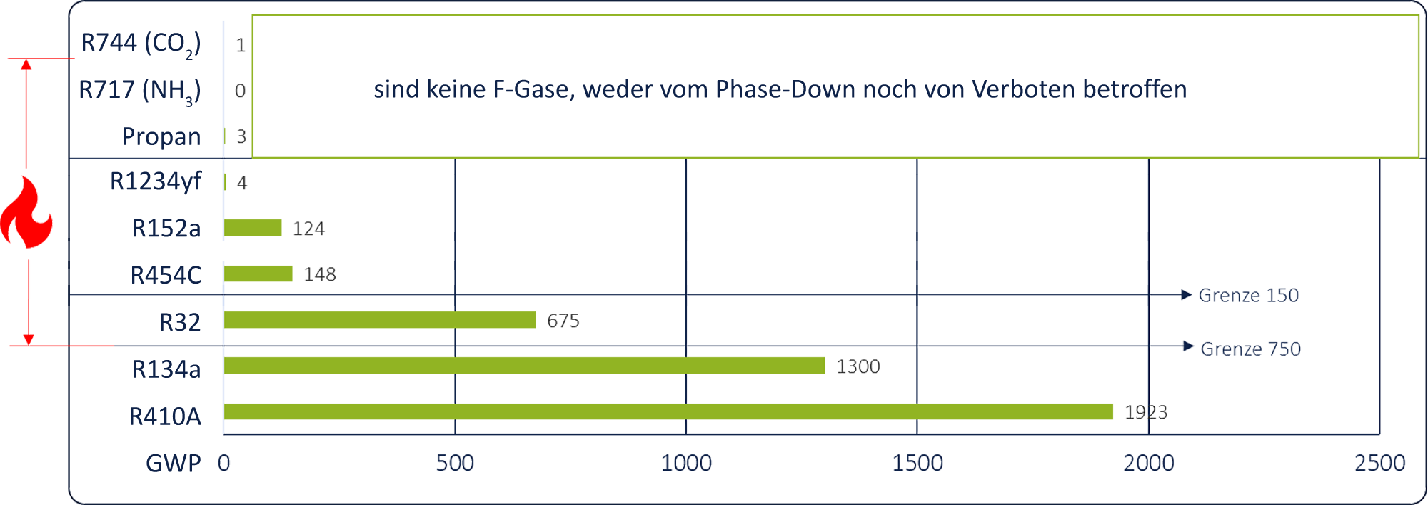 Übersicht Kältemittel, F-Gase und natürliche Kältemittel mit den Grenzen der F-Gase Verordnung und GWP Werten