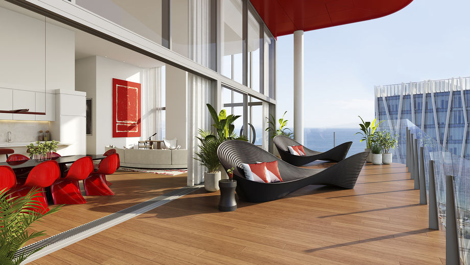 Die Wohnungen sind zwischen 100 und 400 Quadratmetern groß und verfügen über private Terrassen (bis zu 160 Quadratmeter). Die Immobilie bietet außerdem ein ausgewähltes Angebot an Lifestyle- und Wellness-Einrichtungen, darunter The Sky Terrace mit einem Infinity-Pool auf dem Dach, einen Gartenpavillon und einen Paddle-Platz, eine in Spanien sehr beliebte Sportart, ein voll ausgestattetes Technogym-Fitnesscenter mit freien Gewichten und Kardiogeräten, einen Innenpool und einen Whirlpool, eine Yogakabine sowie maßgeschneiderte Dampfbäder und eine Sauna. Im Erdgeschoss des Gebäudes befindet sich das von Sternekoch Romain Fornell geleitete Restaurant Grand Café Rouge mit einer großen, geschwungenen, 9 m hohen Glasfassade. Hier entwarf Kampmann Unterflurkonvektoren in einer Sonderausführung, an die Form der Fronten angepasst und setzte insgesamt 40 m Katherm HK in gebogener Ausführung in den Fußboden ein. Alle Unterflurkonvektoren erfordern ein passgenaues Aufmaß, um eine optimale, individuelle Lösung für das jeweilige Objekt zu gestalten.