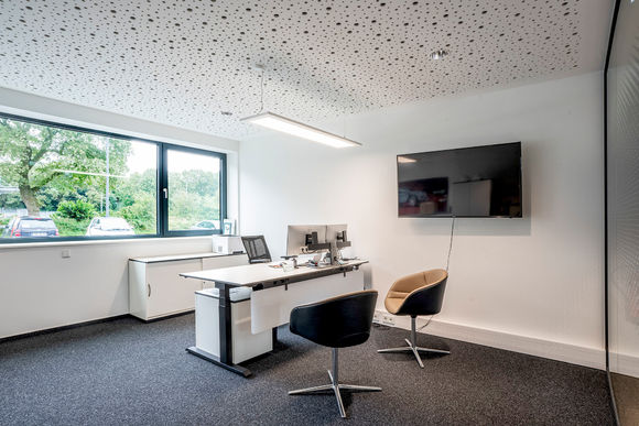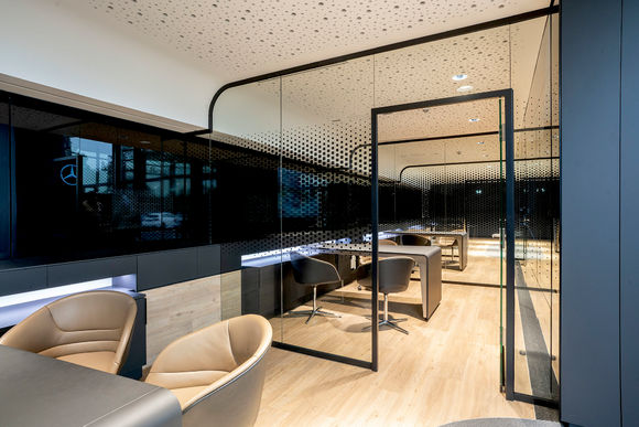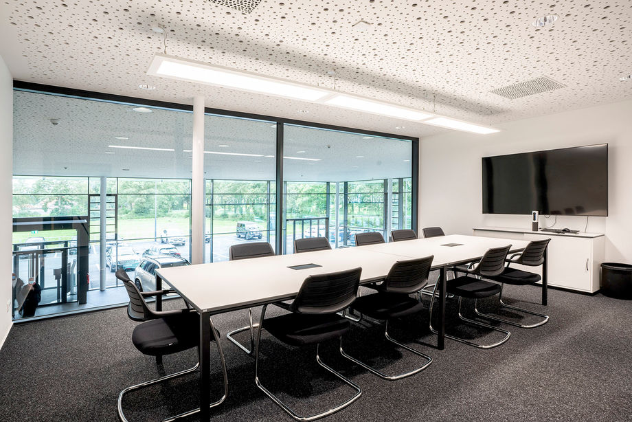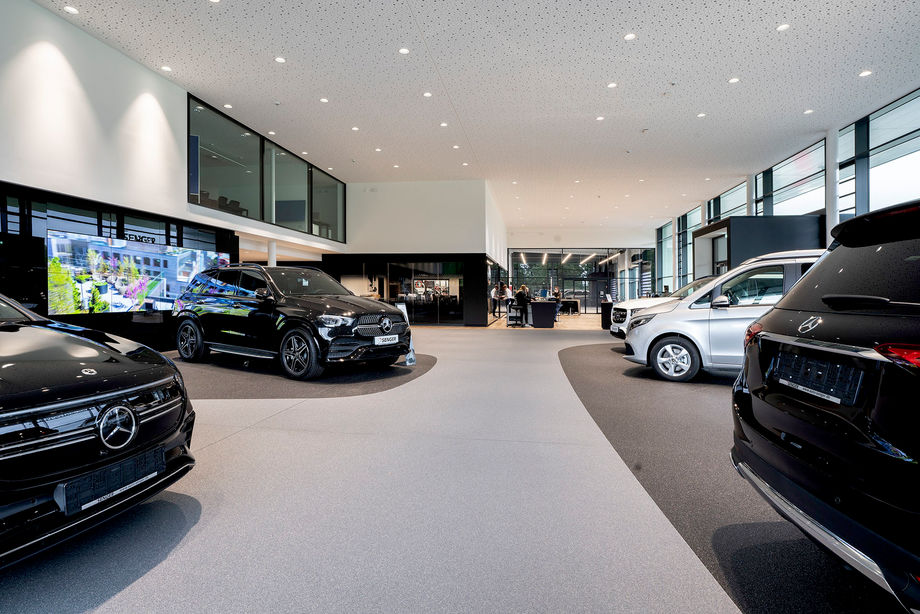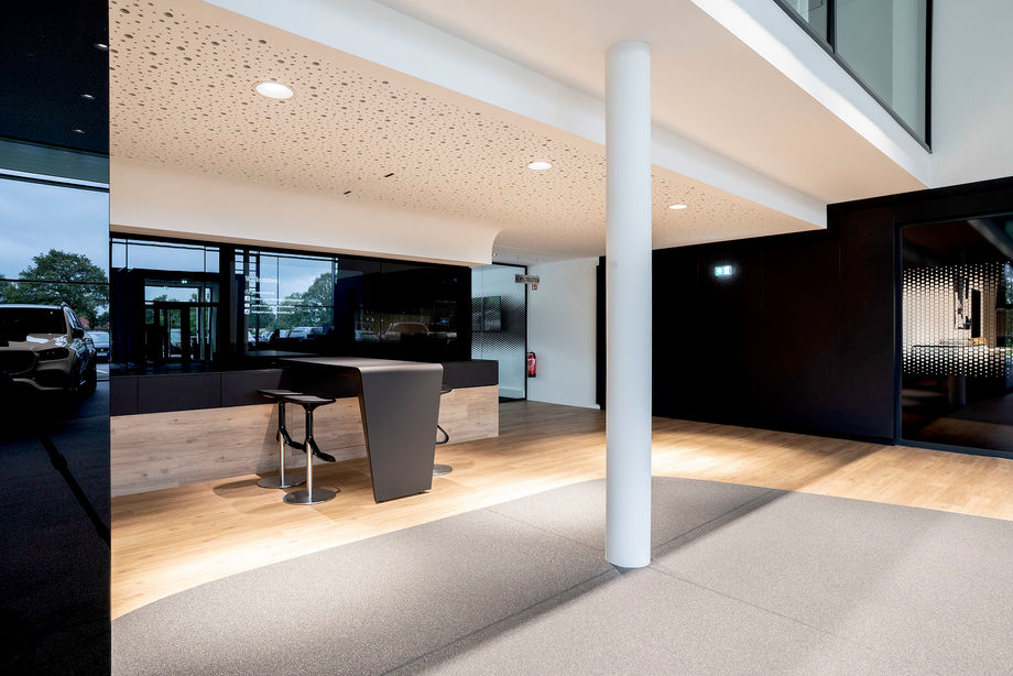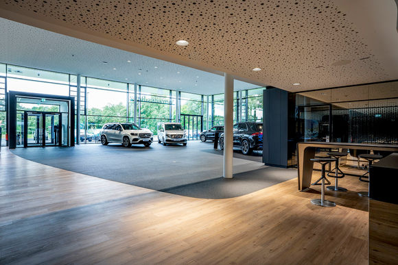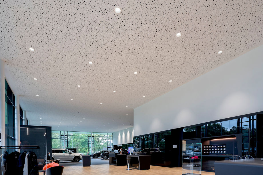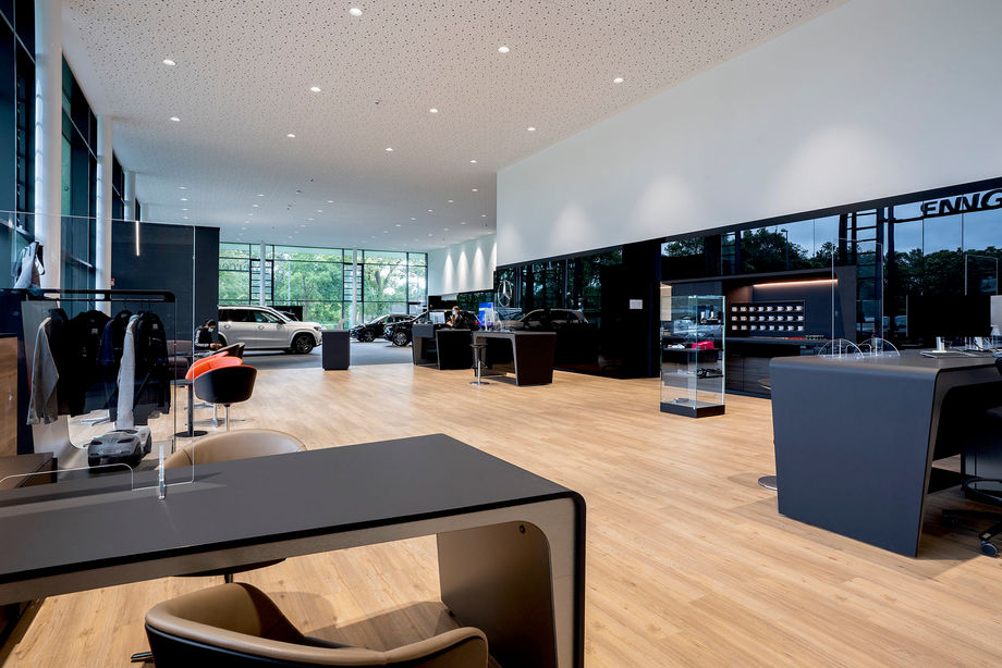 1.400 Einwohner auf´m platten Land: Schirum ist nicht gerade der Nabel der Welt. Und doch ist der Auricher Ortsteil für die Senger-Gruppe der richtige Standort, um dort ein Leuchtturmprojekt zu errichten. Und Senger muss es wissen: Die Autohausgruppe zählt zu den größten in Deutschland und betreibt 50 Betriebe an 39 Standorten – Tendenz weiterhin steigend. Warum ausgerechnet der ostfriesische Standort ein Leuchtturmprojekt ist, erklärt sich leicht, wenn man genau hinschaut. Auf 12.000 Quadratmetern Fläche ist ein über 3.100 Quadratmeter großes Autohaus entstanden. Die wahre Größe liegt aber in der Fortschrittlichkeit: Der Standort setzt Maßstäbe in Sachen Digitalisierung und Vernetzung. Statt Papier gibt es Tablets. Große Displays prägen den loungigen Showroom. Zum Service fahrende Autos werden automatisch gescannt und erkannt. Und wie es sich für einen zukunftsweisenden Standort gehört, wurde auch an den Klimaschutz gedacht: Eine Wärmepumpe mit fünf Erdsonden liefert die Energie zur Beheizung. Und eine Gipskartondecke von Kampmann sorgt für eine effiziente Temperierung.