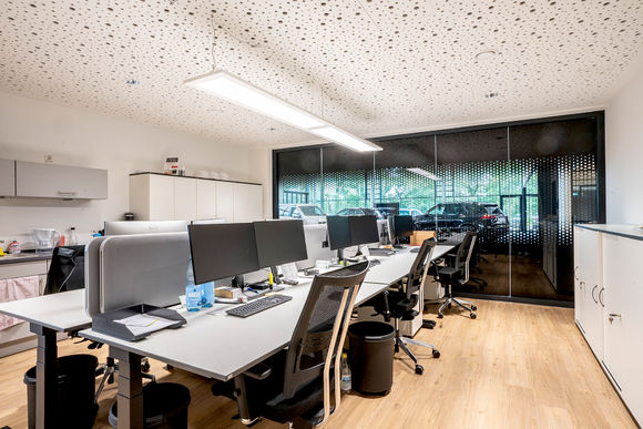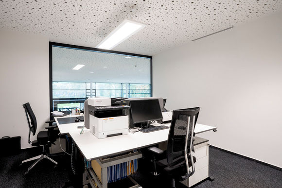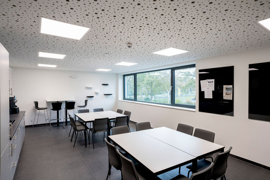 Im Showroom, in Besprechungs-, Büro-, und Mitarbeiterräumen ist ein Gipskartonkühldeckensystem installiert. Das Fluid zirkuliert in Kunststoffmäandern hinter gelochten – und damit akustisch hochwirksamen – Gipskartonplatten. Diesen flexiblen Baustoff im Sinne der Raumtemperierung zu aktivieren birgt viele Vorteile: Die Kühlung erfolgt ohne Geräuschemissionen und mit kaum wahrnehmbaren Luftbewegungen. Das System ist korrosionsbeständig und BVF-zertifiziert. Das Kühlrohr des Flächensystems ist für den Dauerbetrieb bis zu einer Temperatur von 70 °C zugelassen und somit auch für den Heizfall anwendbar. Wobei dieser Wert natürlich nur theoretisch relevant ist. Denn der große Vorteil eines Flächensystems ist die Einspeisung mit geringen Vorlauftemperaturen. Dadurch ist der Betrieb in Kombination mit einem Kaltwassererzeuger/Wärmepumpe sehr beliebt. Für den Heizbetrieb wird die Heiz-/Kühldecke mit einer maximalen Vorlauftemperatur von 35 °C ausgelegt. Insgesamt 235 Quadratmeter Kühldecke sind bei Senger in Aurich installiert worden.