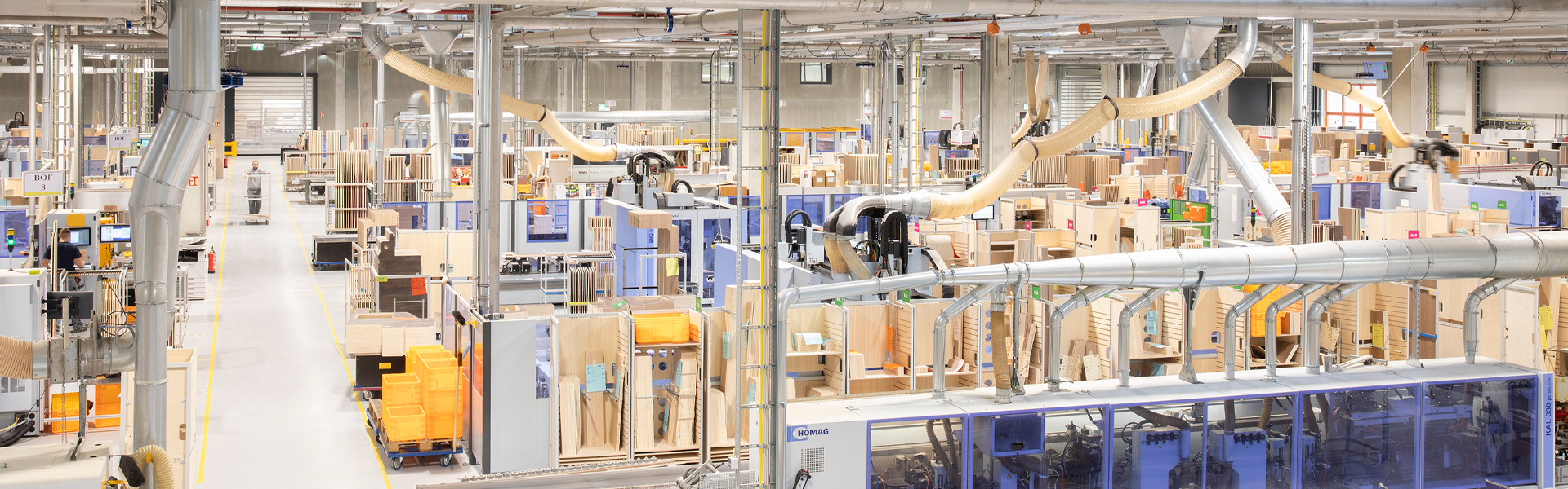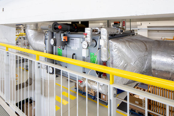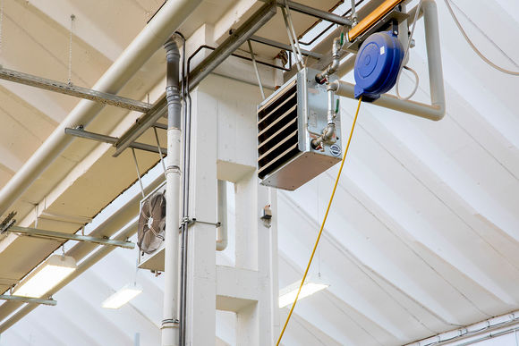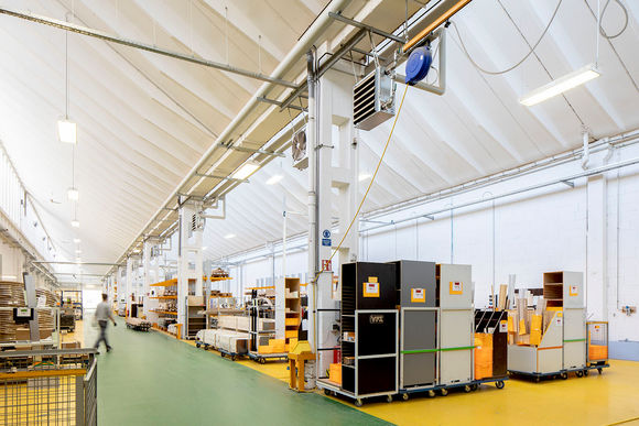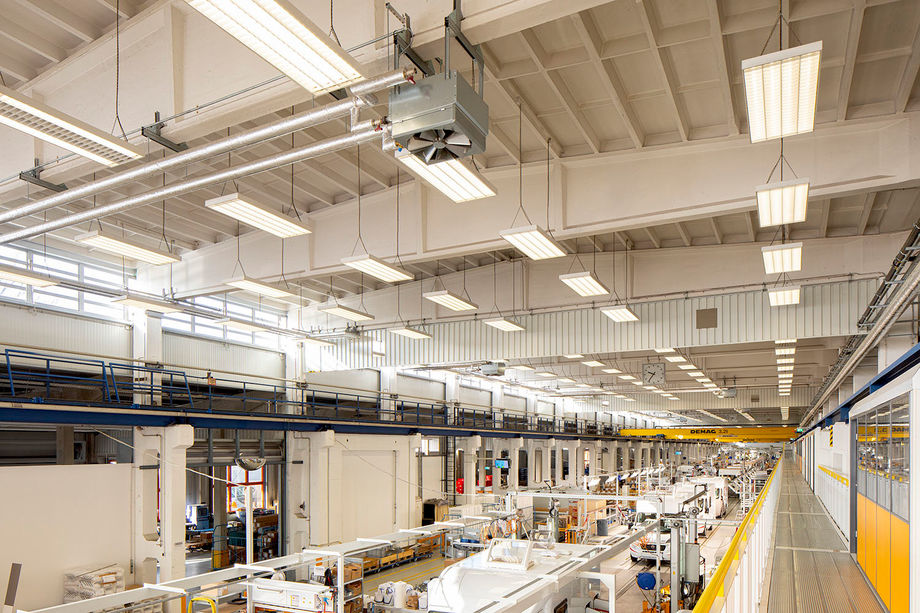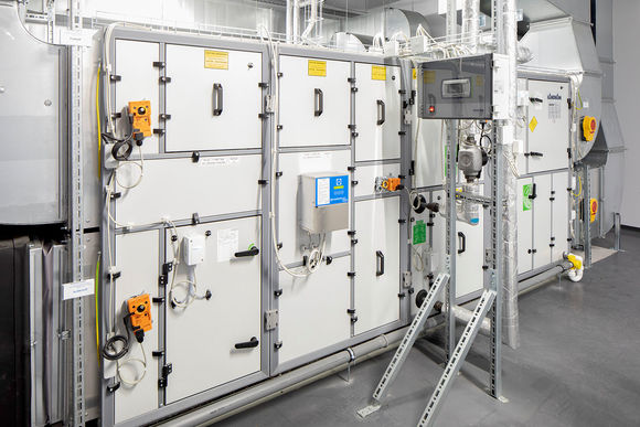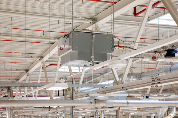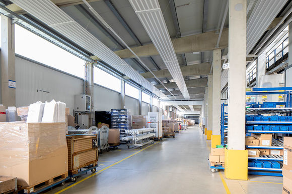 Auf dem Dach der neuen Produktionshalle stehen neun Lüftungsgeräte KaCompact. Diese bilden mit 45 TOP Lufterhitzern das Hybrid ECO System. Hierbei führt das zentrale Lüftungsgerät bedarfsgerecht den hygienischen Anteil Frischluft bis an die Lufterhitzer zu. Die dezentralen Geräte in den Räumen sind für die thermische Aufarbeitung der Um- und Frischluft zuständig. Durch diese Technik können sowohl die Luftkanäle, als auch das RLT-Gerät kleiner ausgelegt werden. Das reduziert die Investitionskosten, sorgt für einen kostengünstigen Betrieb und ermöglicht ein autarkes Temperieren und Lüften von Hallenbereichen. Zwei weitere frei projektierte RLT-Geräte für die Sanitär- und Schulungsbereiche ergänzen das Lüftungsmanagement.
