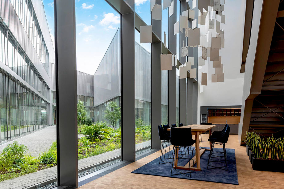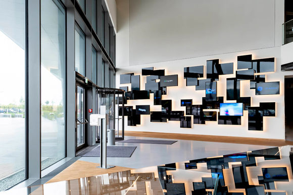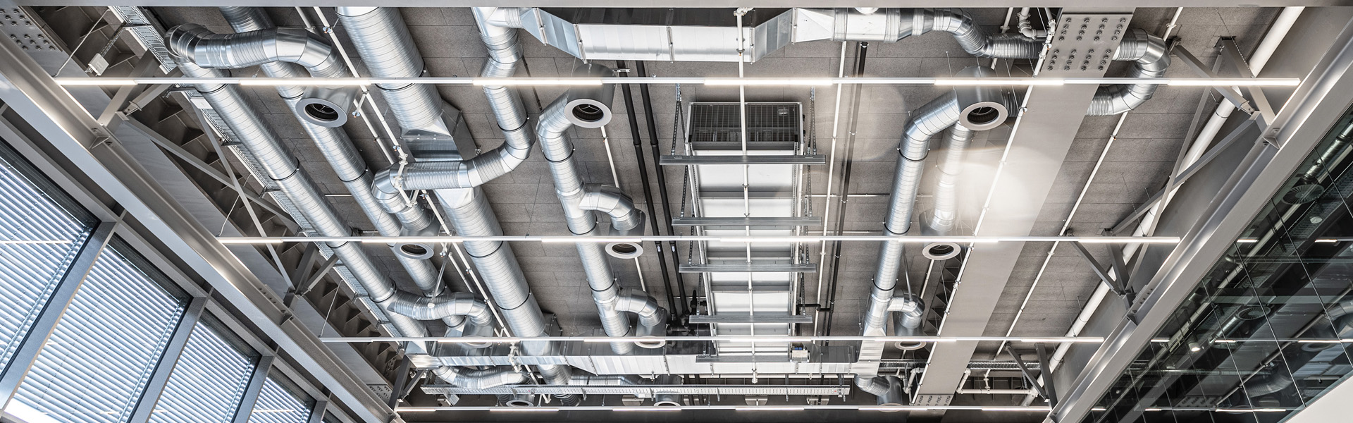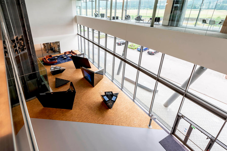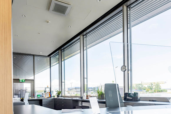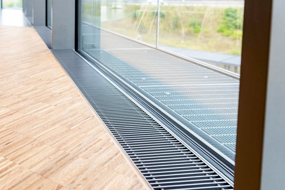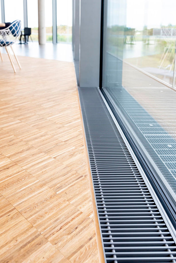 Allen voran wären da Katherm QK Unterflurkonvektoren in Sonderbreite. Das pfeilförmige, größtenteils verglaste Verwaltungsgebäude ist der optimale Einsatzort für die Katherm mit flüsterleisem EC-Querstromventilator. Das Gerät ist individuell anpassbar: Gehrungsecken, gebogene Ausführungen, Säulenaussparungen, Abschrägungen – alle Geometrien sind möglich.