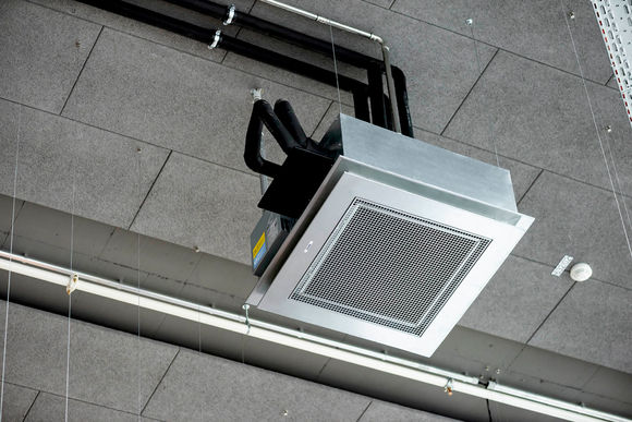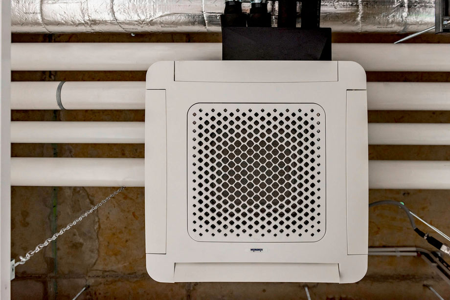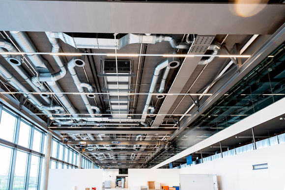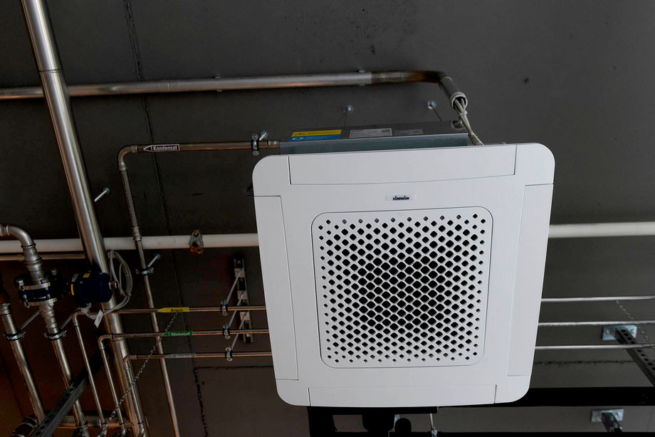 Die Deckenkassette KaCool D AF passt bestimmungsgemäß in das Standardmaß eine Rasterdecke. Bei Concept Laser in Lichtenfels sind die Geräte jedoch nicht in einer Zwischendecke integriert, sondern sind unverkleidet in Sichtmontage unter der Decke angebracht. Der seitliche Luftdurchlass des KaCool D AF nutzt den Coandă-Effekt und sorgt für eine behagliche Einbringung der erwärmten oder gekühlten Luft.
