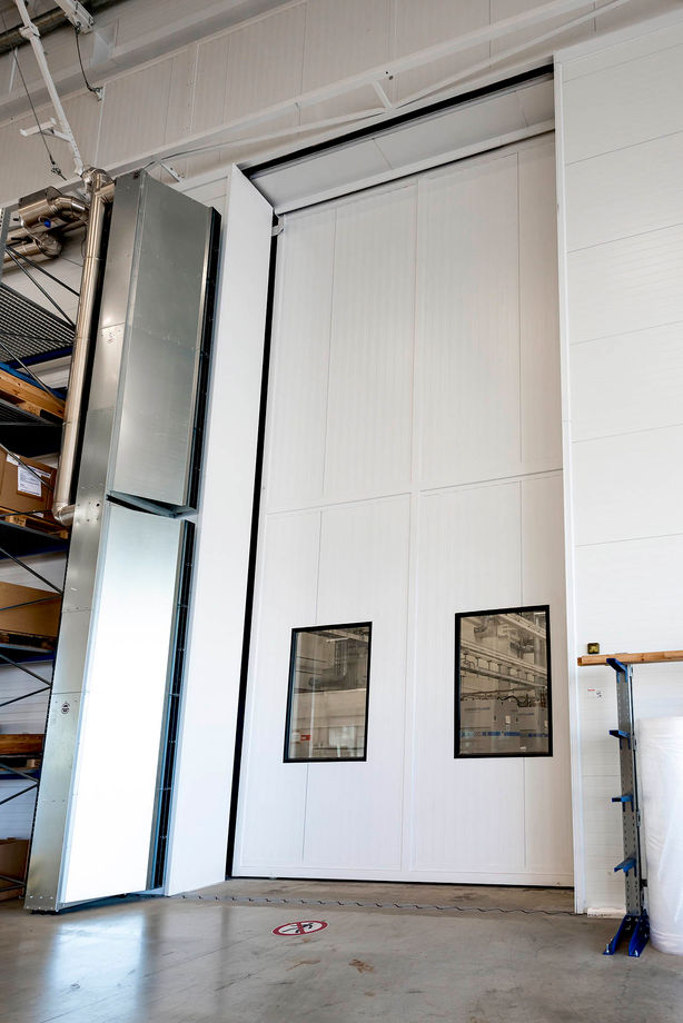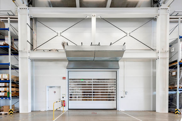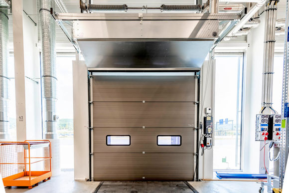Die Hallentore sind mit Torluftschleiern von Kampmann vor Kaltlufteinfall geschützt: Der ProtecTor ist dank seiner patentierten Technologie aus untemperierten Vorschleier und Warmluftschleier nicht nur besonders effektiv, sondern auch noch sparsam. Standardmäßig werden die Torluftschleier horizontal über dem Tor angebracht. Bei Concept Laser gibt es aber auch die vertikale Variante: Zwei übereinander montierte ProtecTor sorgen bei überhohen Toren dafür, dass das angenehme Klima drinnen bleibt.