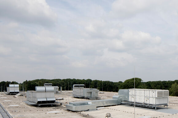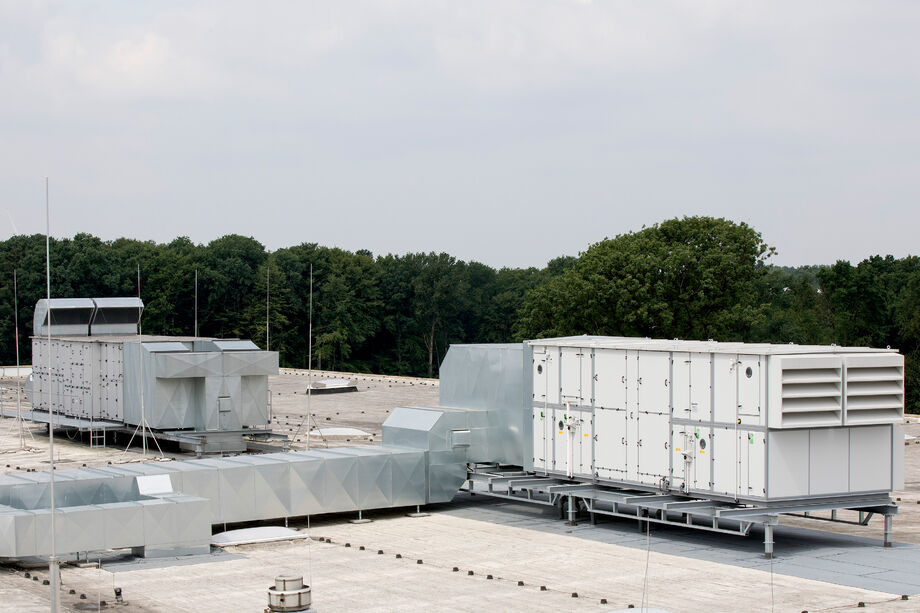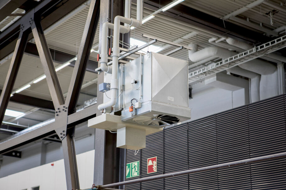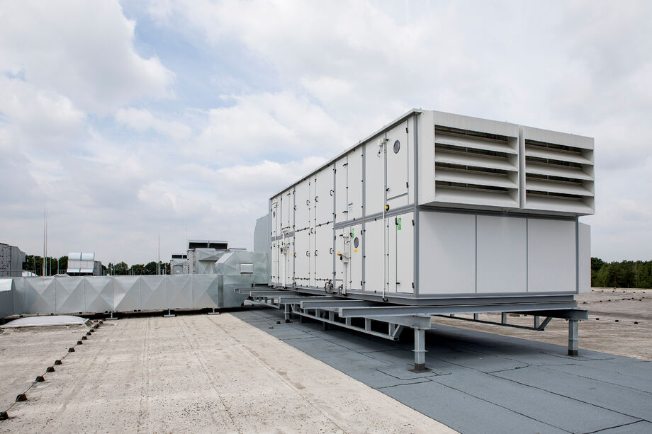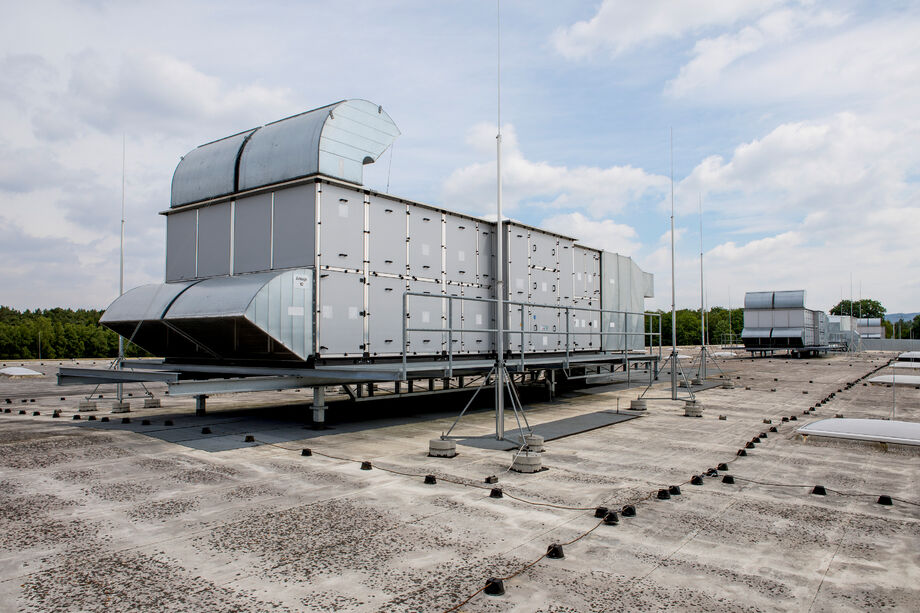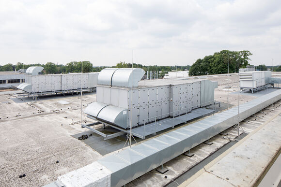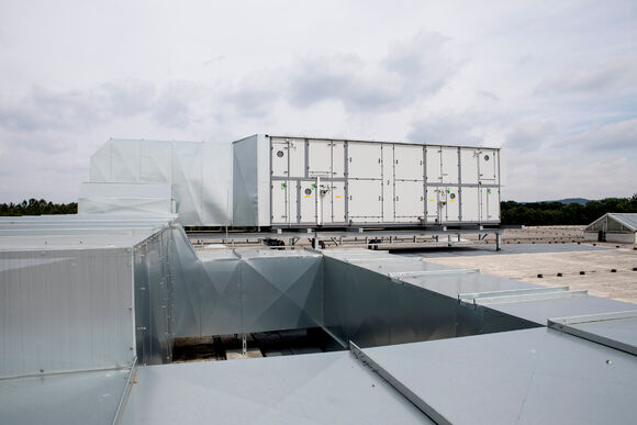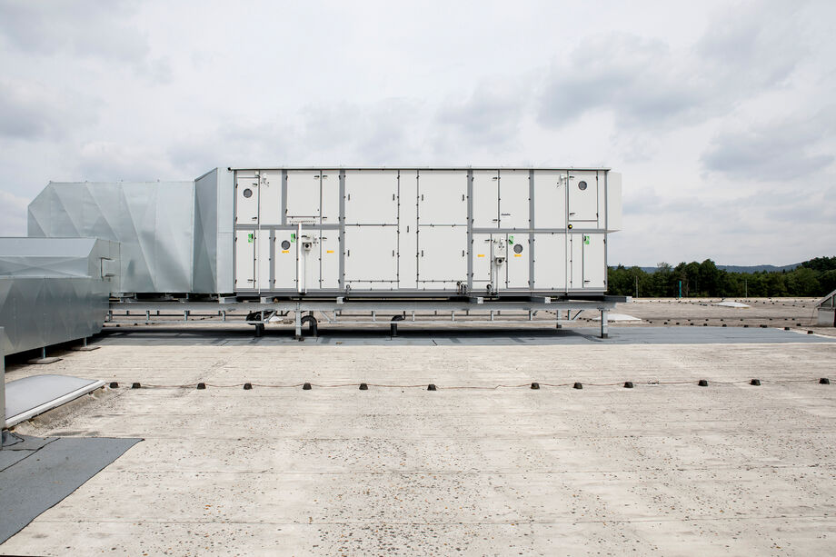 Alleine auf dem Dach der Halle 5 stehen fünf RLT-Geräte. Ihnen kommen mehrere Aufgaben zu: Sie sorgen im Inneren der Halle für eine konstante Raumtemperatur, die für die hochpräzisen Maschinen und Fertigungsprozesse wichtig ist. Sie tauschen die durch ölhaltige Emissionen belastete Luft aus. Und sie gewährleisten dadurch zudem ein angenehmes Klima für die Mitarbeiter.