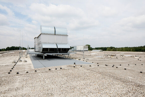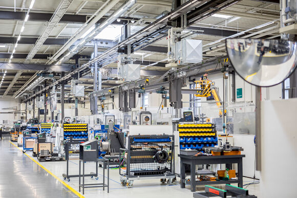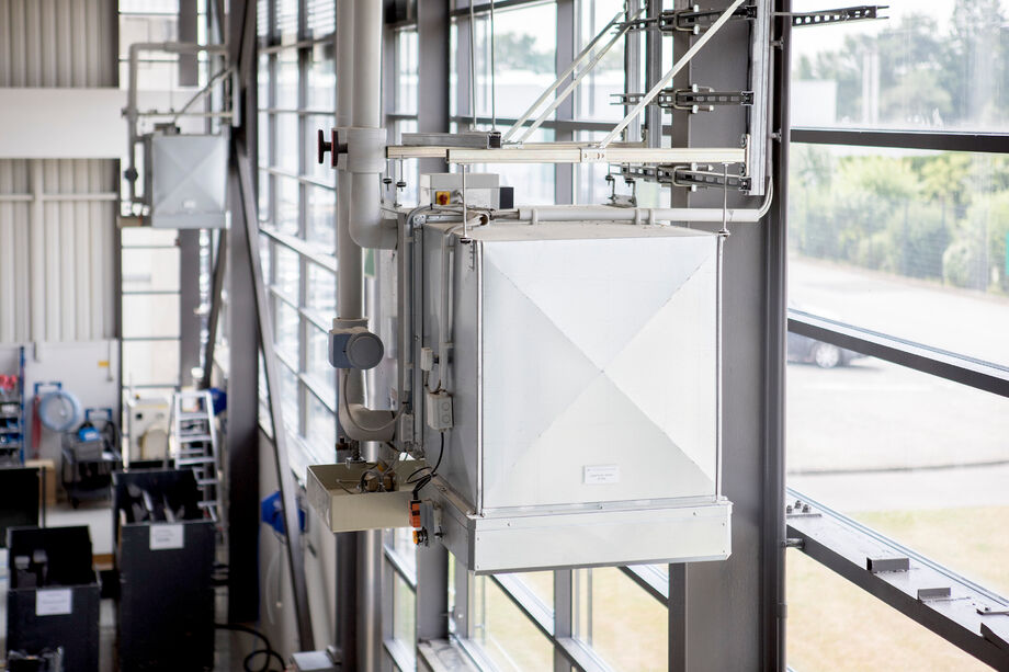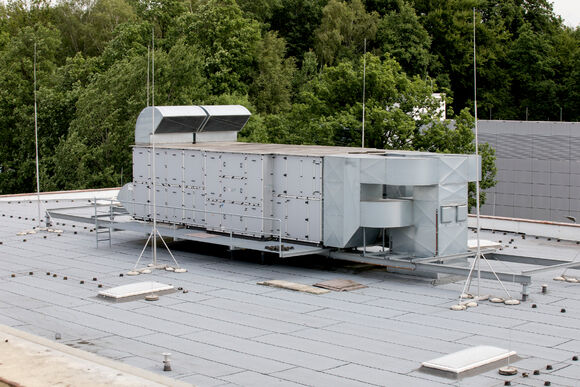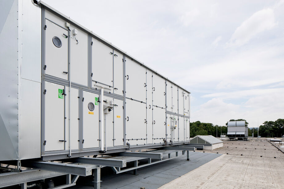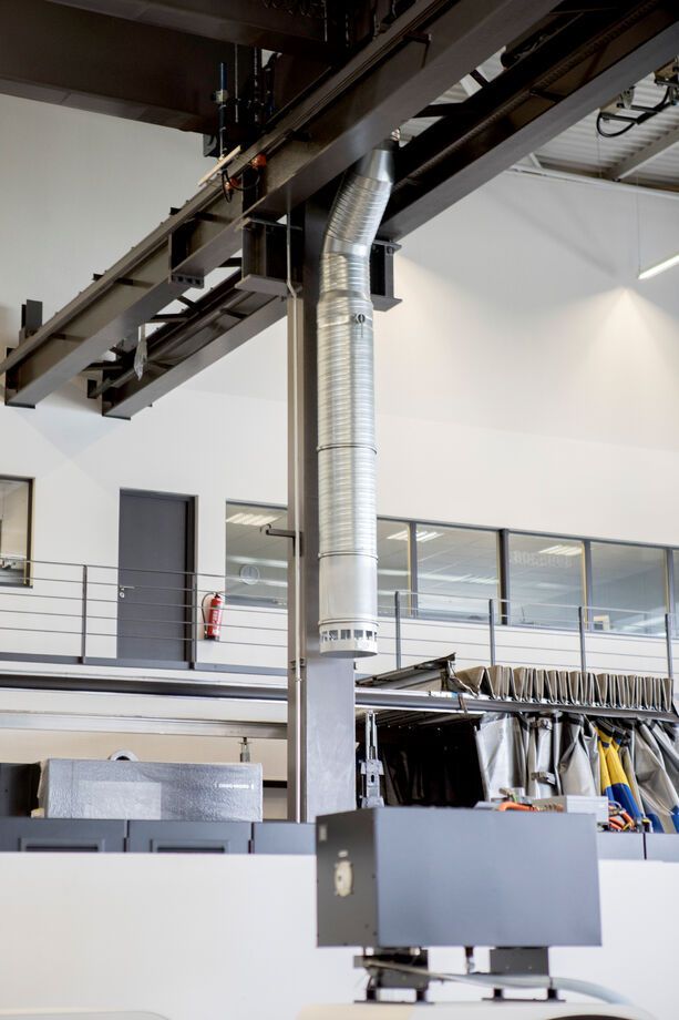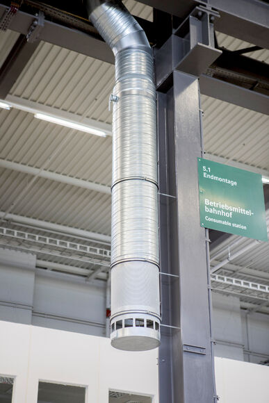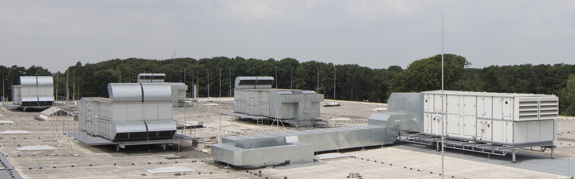 Alleine auf dem Dach der Halle 5 stehen fünf RLT-Geräte. Ihnen kommen mehrere Aufgaben zu: Sie sorgen im Inneren der Halle für eine konstante Raumtemperatur, die für die hochpräzisen Maschinen und Fertigungsprozesse wichtig ist. Sie tauschen die durch ölhaltige Emissionen belastete Luft aus. Und sie gewährleisten dadurch zudem ein angenehmes Klima für die Mitarbeiter.