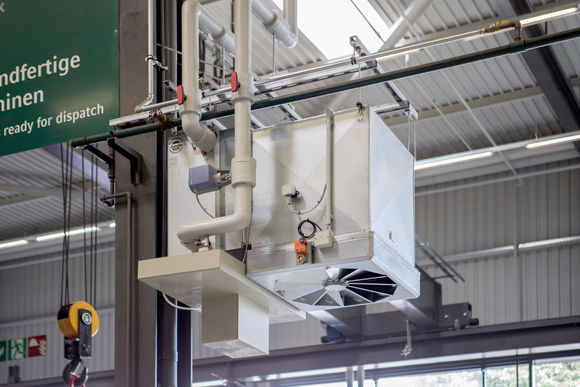 Die Nachkühlung innerhalb der Hallen wird über TOP-Lufterhitzer vorgenommen. Hiervon sind bei Gildemeister insgesamt 72 Stück installiert. Sie sind zusätzlich mit dem KaMax-Luftauslass ausgestattet, mit dem zum einen große Einblashöhen überwunden und zum anderen die Luft je nach Bedarf gerichtet werden kann.
