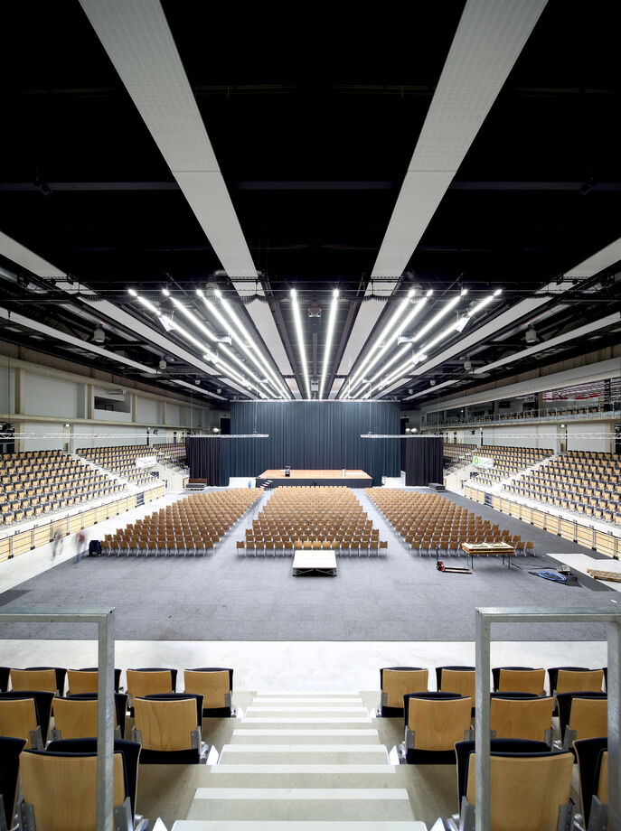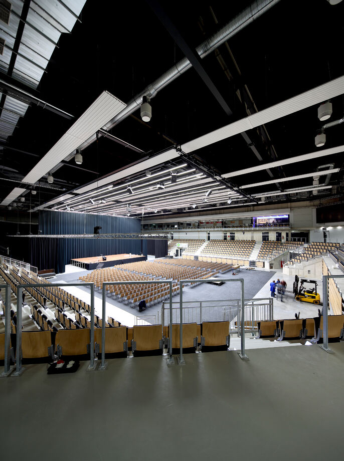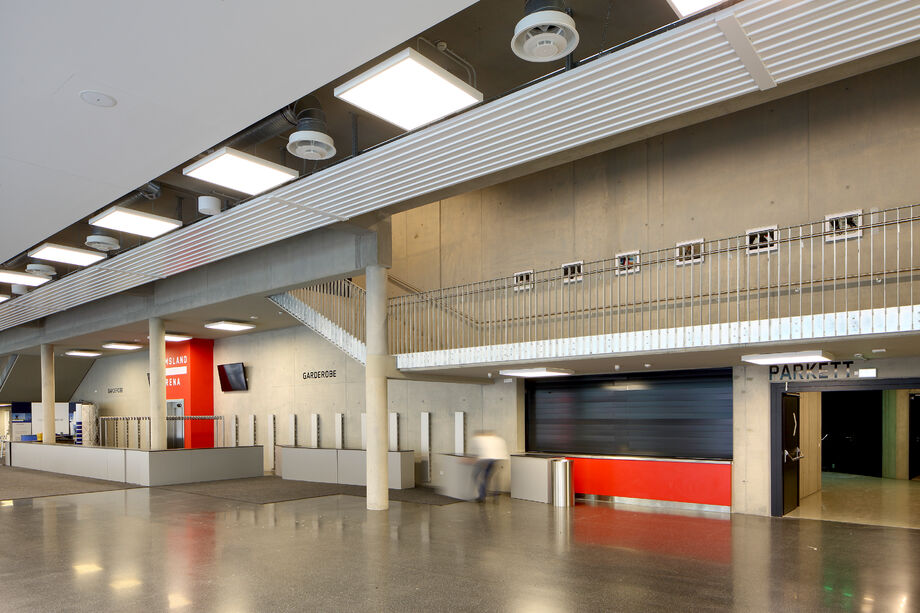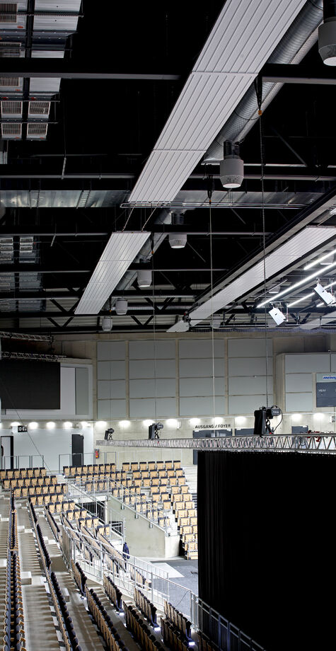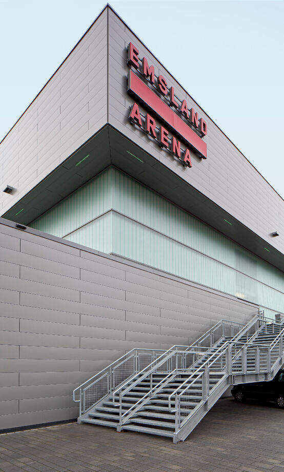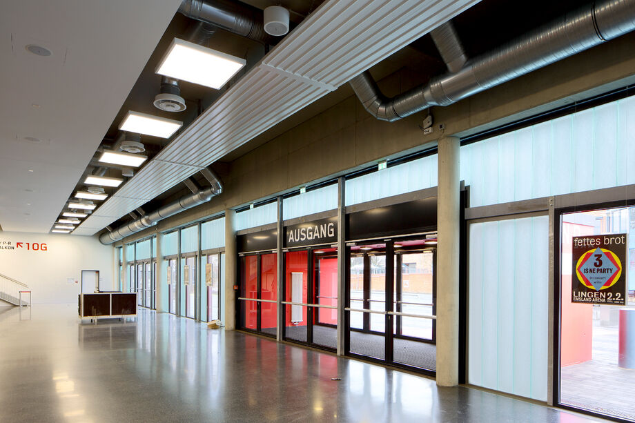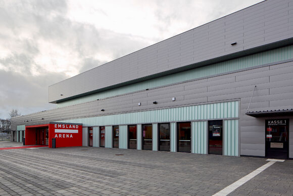 Die EmslandArena gilt als eines der Leuchtturmprojekte für das Emsland. Als Multifunktionshalle konzipiert, bietet der Neubau den perfekten Rahmen für Konzerte, Messen, Sportevents, Tagungen – kurz für Veranstaltungen jeglicher Art und jeden Zuschnitts. Eine Temperierung mit niedrigen Betriebskosten erfolgt in der EmslandArena in erster Linie durch insgesamt rund 420 laufende Meter Galaxis Deckenstrahlplatten. Unabhängig von der Lüftungsanlage erzeugen sie im Foyer und in der Veranstaltungshalle dank Strahlungswärme ein äußerst angenehmes Klima. Durch die gelochte Ausführung der Deckenstrahlplatten für die Veranstaltungshalle kann der auftretende Schallpegel verringert und die Nachhallzeit verkürzt werden.