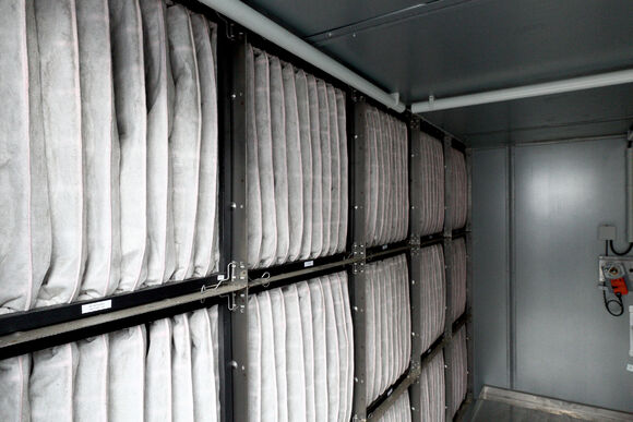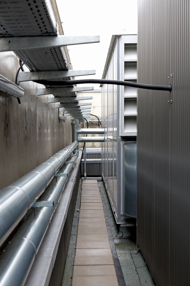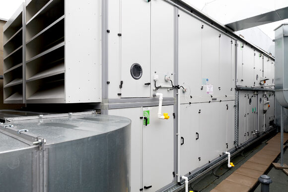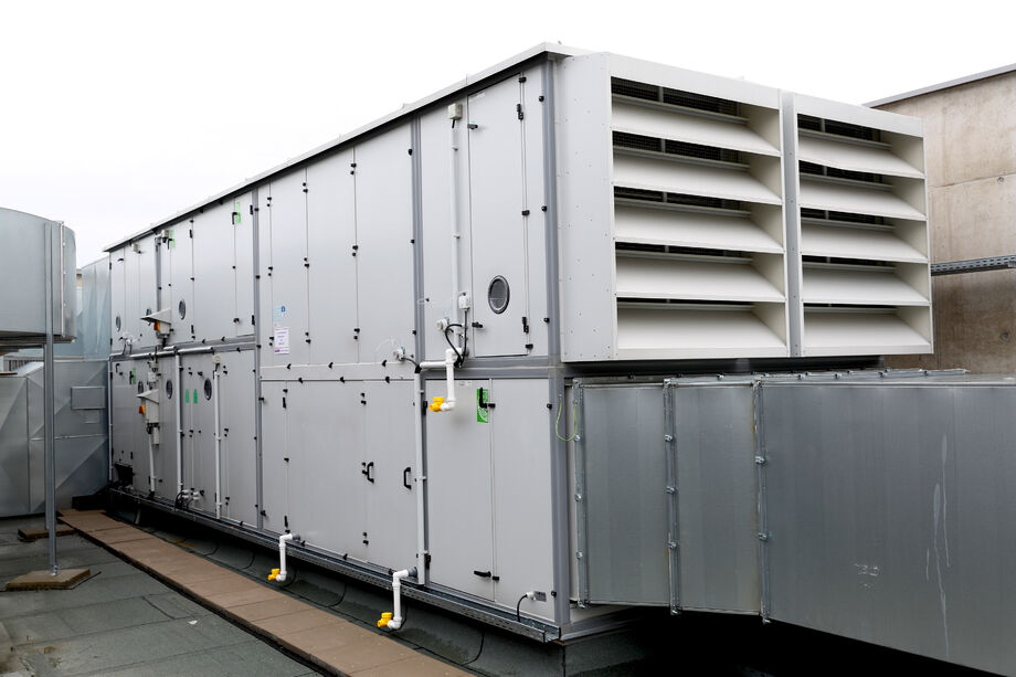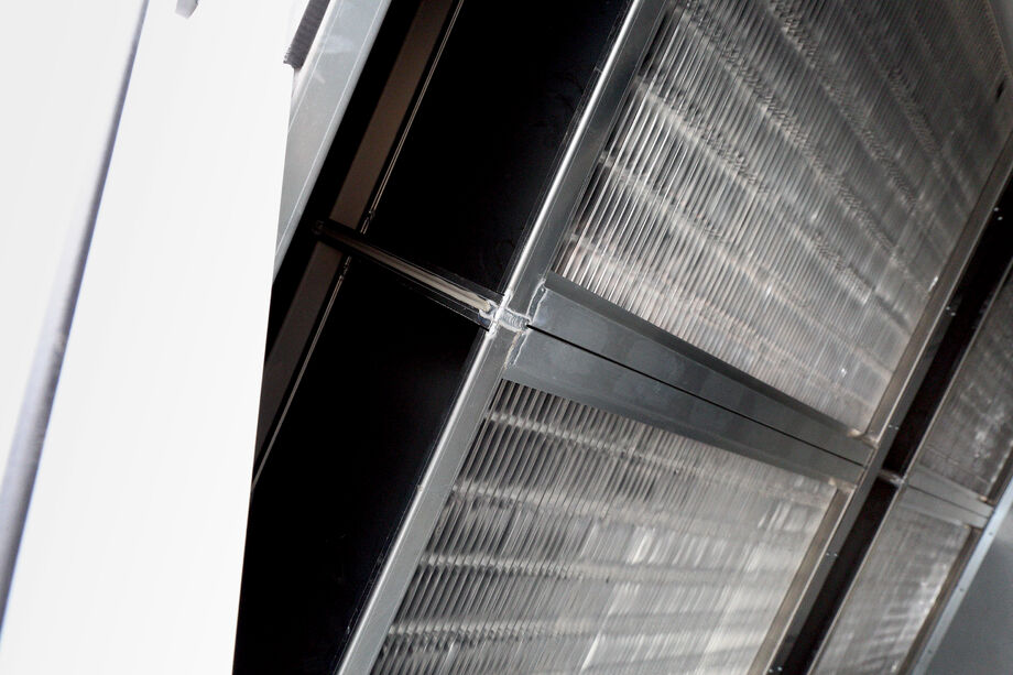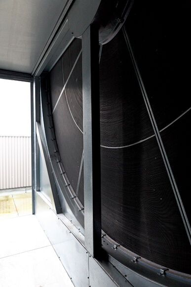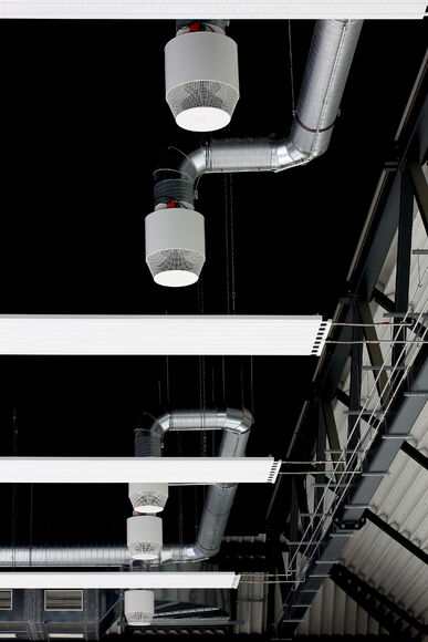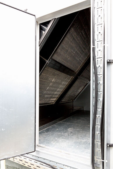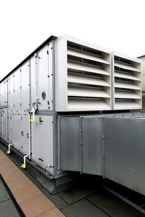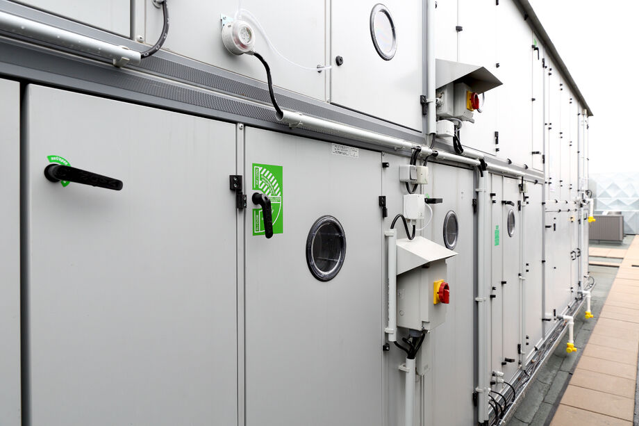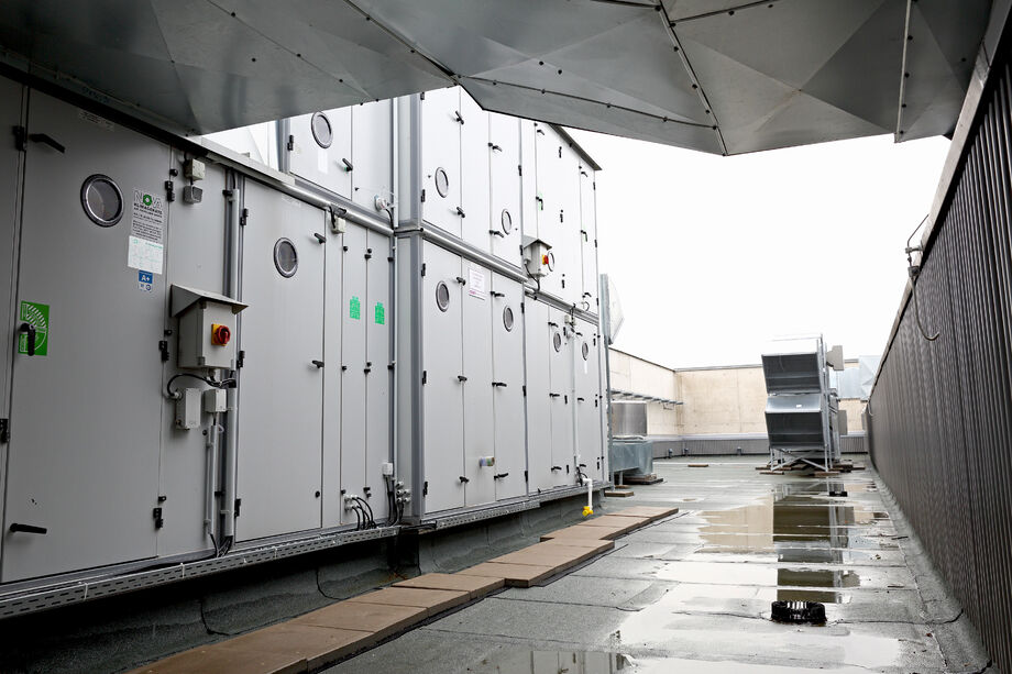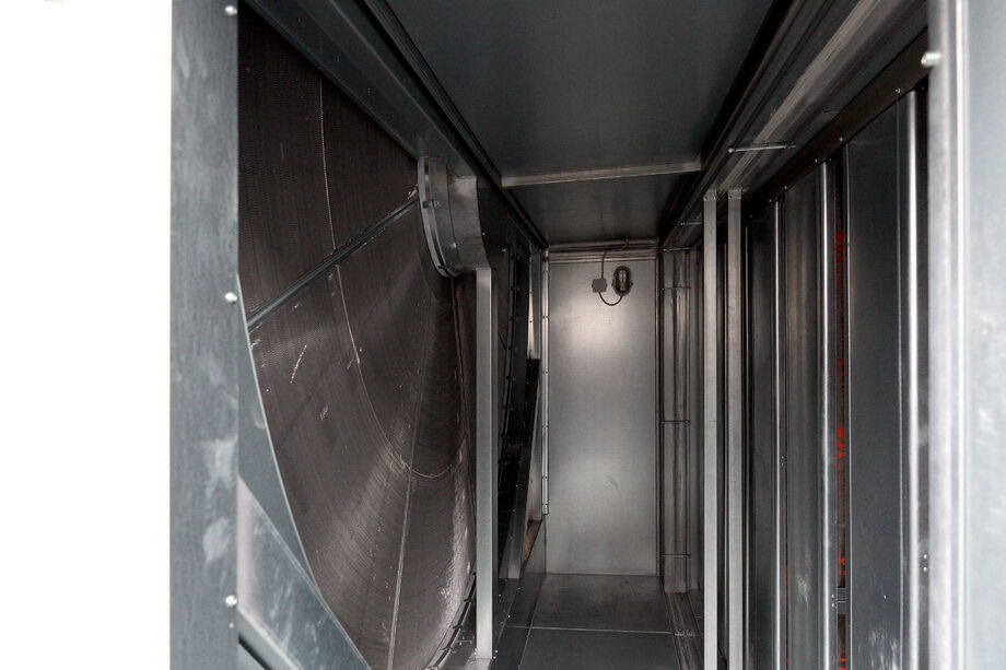 Für die Be- und Entlüftung der EmslandArena sind vier Zentrallüftungsgeräte in Außenaufstellung auf dem Dach des Gebäudes installiert. Zwei Geräte sind mit einer Wärmerückgewinnung über Diagonal-Plattenwärmetauschern ausgestattet. Sie versorgen sämtliche Nebenräume, wie beispielsweise das Foyer, Gastro-Bereiche, Küchen, Flure, WCs und die Logen. Durch die Verwendung von Plattentauschern ist eine Übertragung von der Abluft auf die Zuluft ausgeschlossen, so dass die belastete Abluft nicht in die Räume zurückgeführt wird. Die beiden anderen Geräte verfügen über Rotationswärmetauscher, sie be- und entlüften die komplette Veranstaltungshalle. Mit je 40.000 m3/h Luftmenge lassen sich diese beiden Geräte bei einer Teilnutzung separat betreiben – ideal für das flexible Nutzungsspektrum der Veranstaltungshalle. In Spitzenzeiten bringen alle Geräte zusammen bis zu 140.000m3/h frische Luft. Um die Zuluft auf Raumtemperatur zu erwärmen und Zugerscheinungen zu vermeiden, sind die Geräte mit einem Nachheizregister ausgestattet. Weiterhin sind Schalldämpfer und vorbereitet Anschlüsse für eine bauseitige Gebäudeleittechnik integriert. Die Planung und Produktion der Geräte erfolgte über die Nova Apparate GmbH in Donaueschingen.