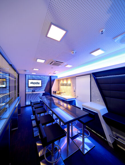 Weitere Kampmann-Produkte wurden in der Loge als raumgestaltende Elemente eingesetzt. Roll-Roste Optiline aus Edelstahl sind dekorativ, zum Teil mit Gehrungsecken, in Tischen und Sideboard eingelassen. Eine Abdeckung aus Sicherheitsglas schützt die Roste, welche sonst üblicherweise zur Abdeckung von Bodenkanälen verwendet werden. Unter der über Eck verlaufenden Sitzbank sind Linear-Roste mit Edelstahlblechen als Wandverkleidung kombiniert. Sie demonstrieren eine beispielhafte Fassadenverkleidung. An einer Seitenwand wurde eine Eingangsmatte ebenfalls als Wandverkleidung montiert, in die ein Fernseher eingelassen ist. Die maßgefertigte Eingangsmatte Portagard A steht beispielhaft für eine umfangreiche Auswahl an Materialien, Farben und Eigenschaften je nach Bedarf für Schmutzaufnahme und Belastbarkeit.