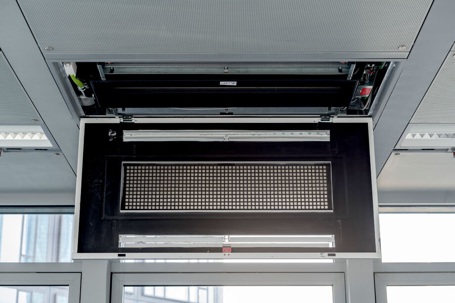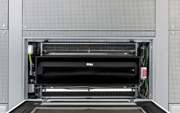 Der KaDeck besitzt einen EC-Querstromventilator zu Beschleunigung der Luft, was ihn besonders leise und effizient macht. Die im Eurotheum verwendete Variante mit feuchter Kühlung sorgt außerdem für ein Plus an Leistung. Überzeugend auch das Revisionskonzept: Im Wartungsfall lässt sich die gesamte Geräteunterseite ausklappen, sodass man alle wartungsrelevanten Komponenten im direkten Zugriff hat. Eine bauseitige Revisionsöffnung erübrigt sich somit.