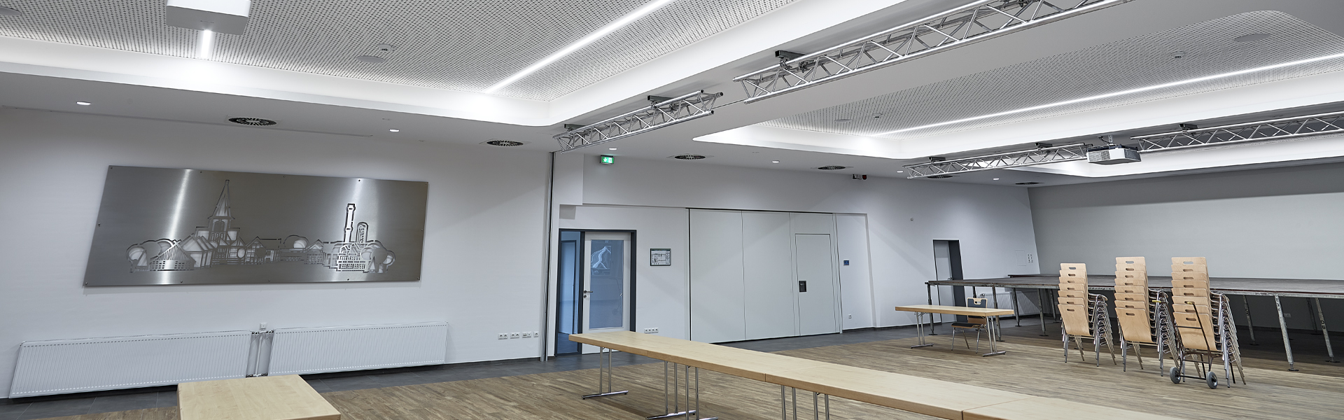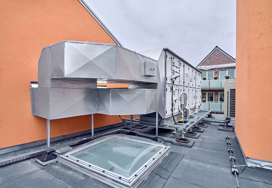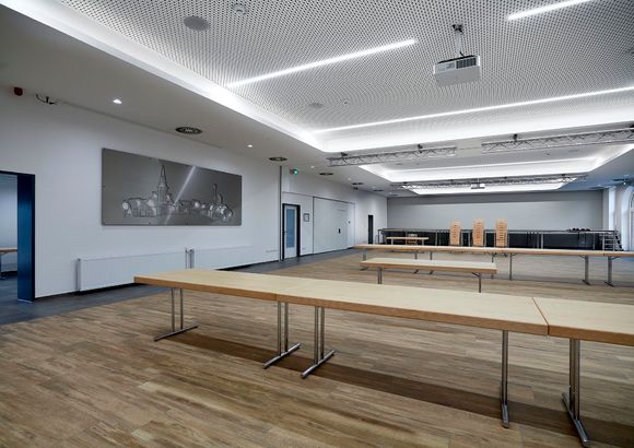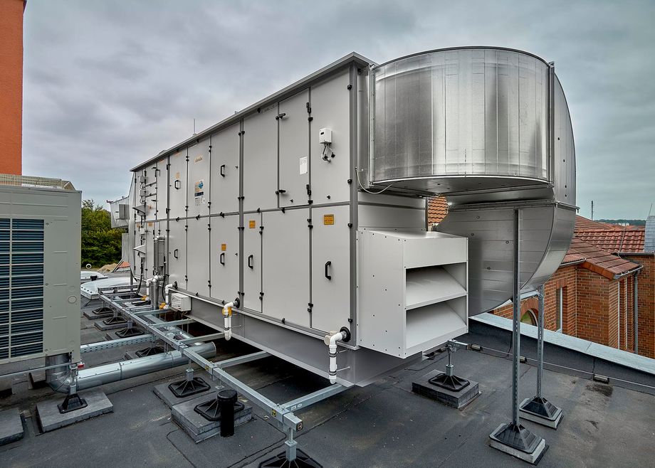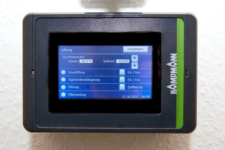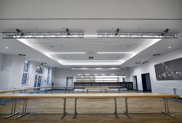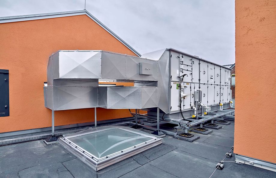 Als Teil des Sanierungspaktes wurde auf dem Dach eine RLT-Anlage von Kampmann installiert. Das Gerät dient dem Luftwechsel im ehemaligen Festsaal: Bis zu 6.500 m3/h Luft bewegt das Gerät und ist damit recht klein, im Vergleich zu anderen RLT-Anlagen, die zum Beispiel in Bädern oder Industriegebäuden Zehntausende Kubikmeter Luft verarbeiten. Der Zweck ist aber immer der Gleiche: Verbrauchte Luft abtransportieren, frische Luft zuführen. Das sorgt nicht nur für ein angenehmes, sauerstoffreiches Klima, sondern auch dafür, dass sich keine kritische Menge an Viren, Staub und Allergenen in der Luft anreichert. Das Lüftungsgerät lässt sich individuell über ein Raumbediengerät mit Touch-Display steuern.