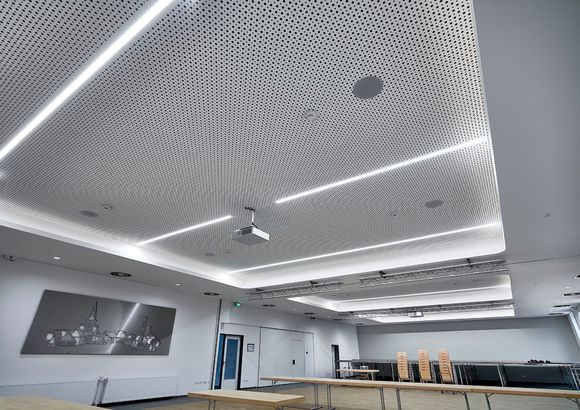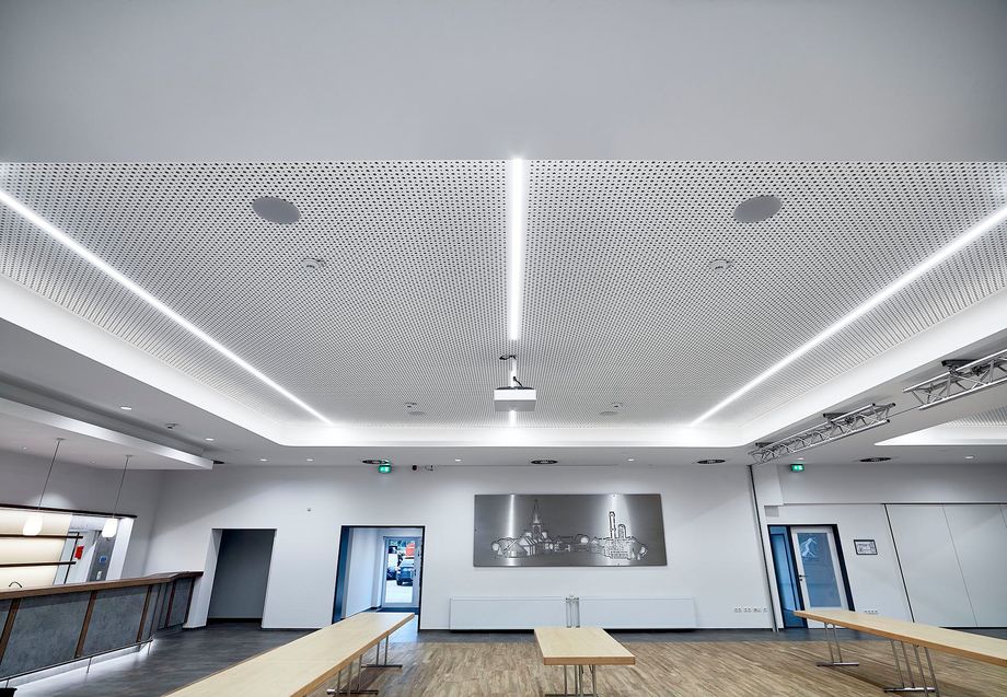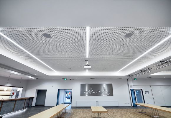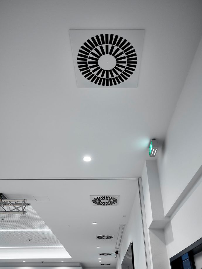 Eingebracht wird die Luft über DAL 359 von Kampmann. Diese Dralldurchlässe besitzen radial angeordnete Luftaustrittsöffnungen und sind in Salzbergen in der Zwischendecke montiert. Durch seine strömungsoptimierten Luftlenkelemente erzeugt der DAL 359 einen geringen Druckverlust. So bleibt das Gerät auch bei hohen Volumenströmen leise und ermöglicht eine zugfreie Lufteinbringung. Die nachträgliche Einstellung der Luftlenkelemente ist jederzeit möglich.