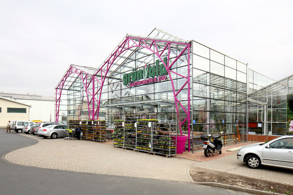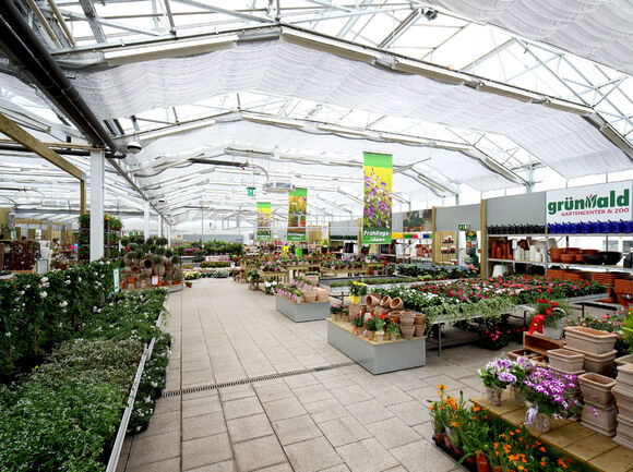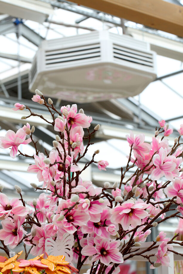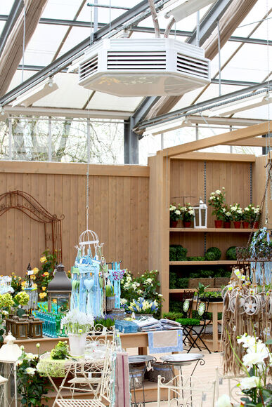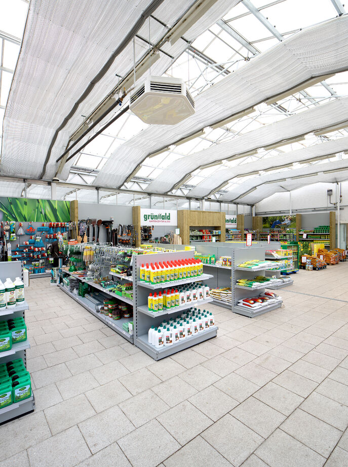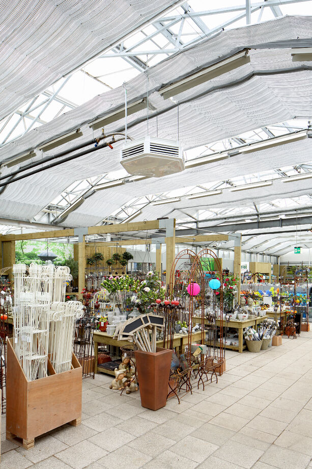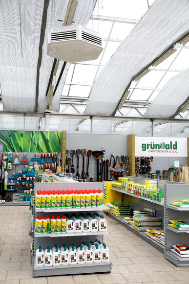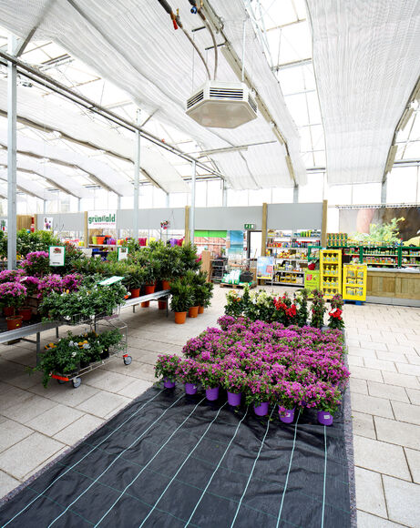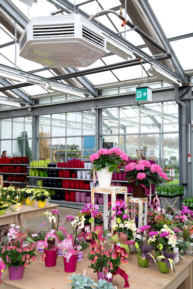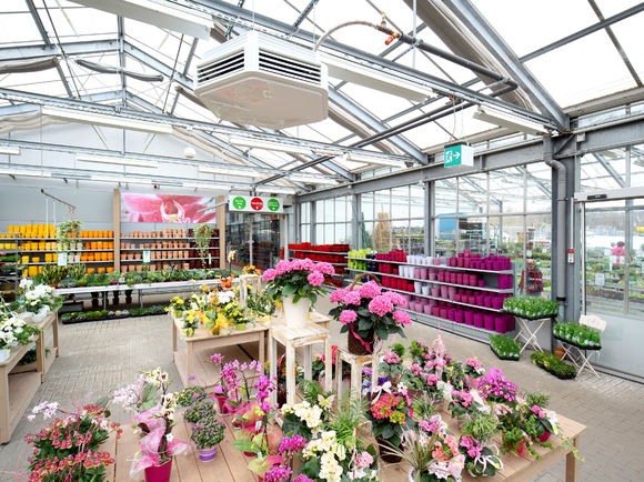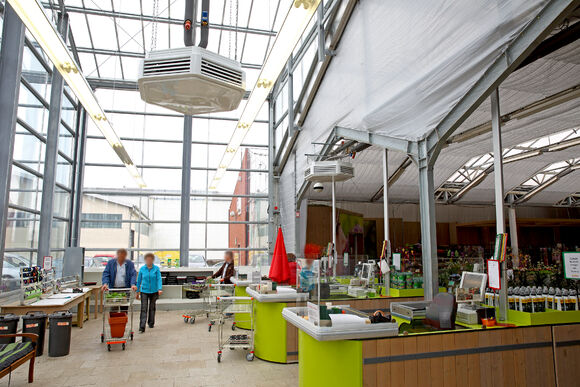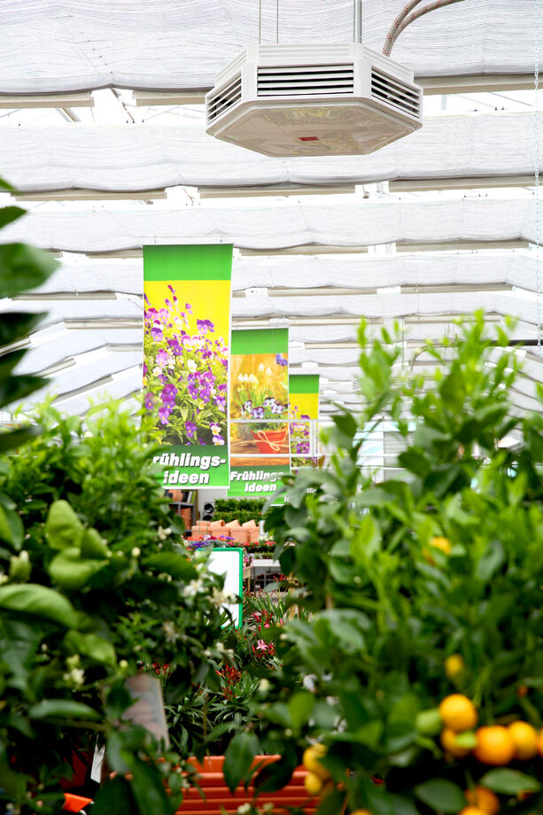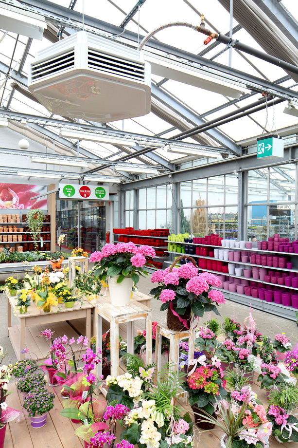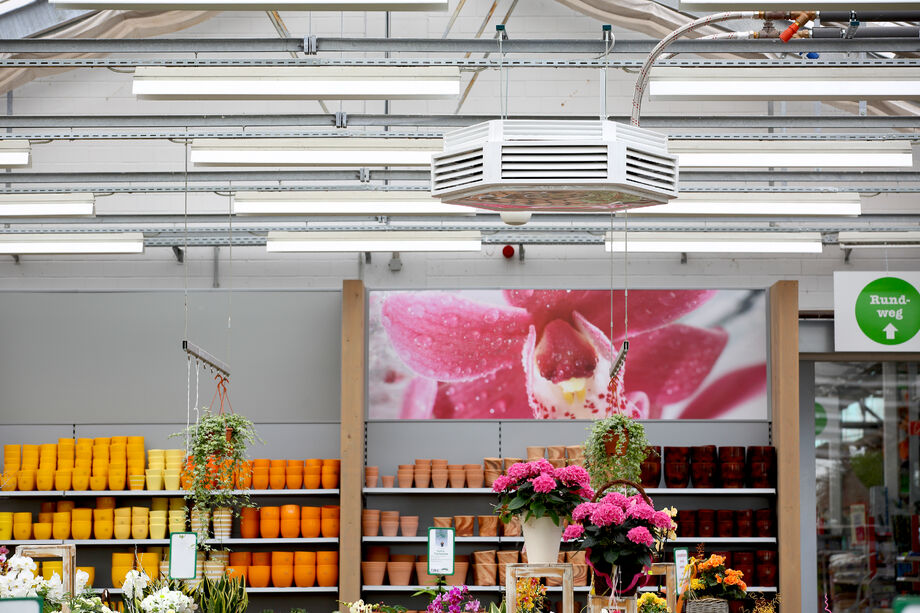 Ein Dutzend Lufterhitzer Ultra wurden im Garten-Center für die rundum verglasten Verkaufsflächen nachgerüstet. "Der leistungsstarke Ultra schafft auch bei großflächigen Verkaufsräumen ein zuverlässiges Wohlfühlklima für die Kunden"