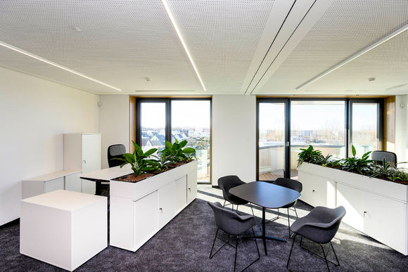 Betritt man die neuen Büroräume, überzeugt sofort die angenehme Atmosphäre: Prinzipien von Open Space und New Work gehen Hand-in-Hand. Optisch schafft ein Mix aus Kühle und Klarheit sowie Wärme und Natürlichkeit ein ausgewogenes Bild: Säulen aus Sichtbeton treffen auf Grünpflanzen, das Echt-Holz der Fensterlaibungen trifft auf das reine Weiß der Gipskartondecke. Und damit wären wir bei Kampmann.