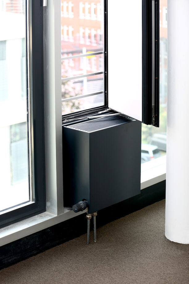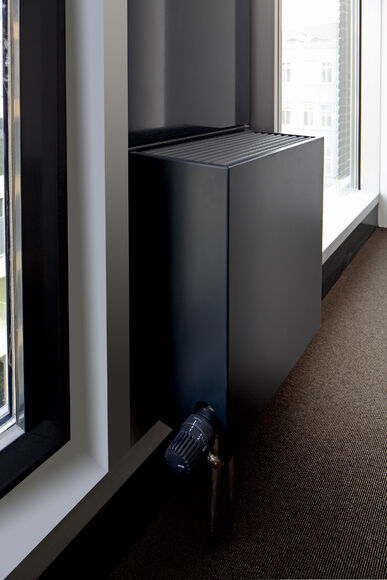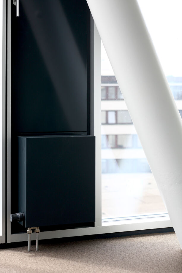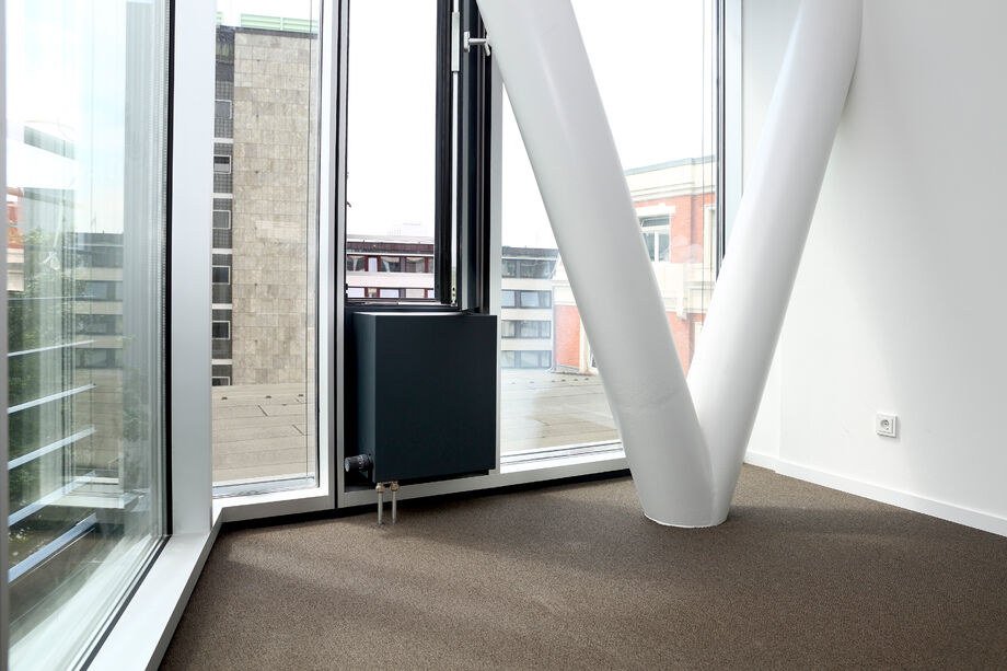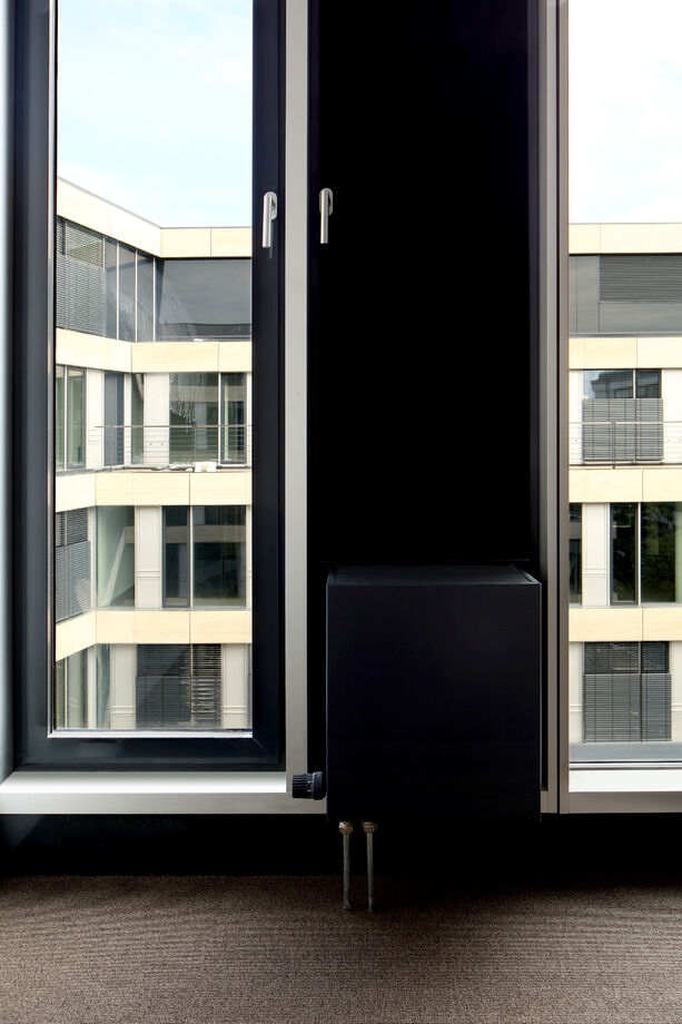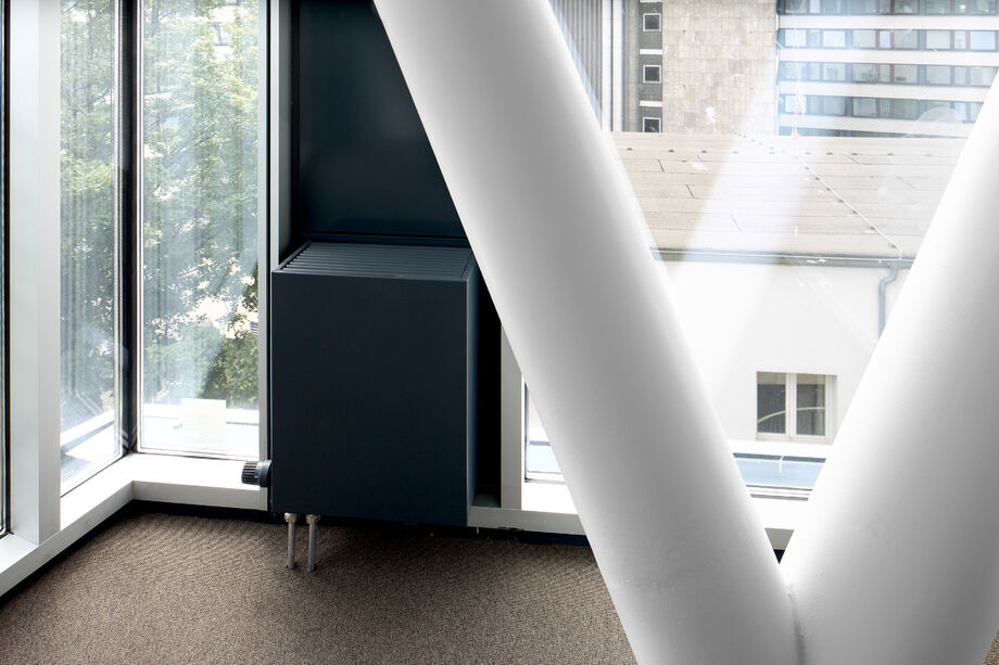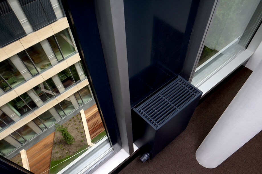 Für das Bürogebäude mit insgesamt 13.200 m2 Mietfläche wurde hinsichtlich der Abmessungen von PowerKon + W eine schmale Sonderkonstruktion für den Nischeneinbau entwickelt. Eine weitere Besonderheit sind die Anschlüsse für Vor- und Rücklauf von unten über einen Hahnblock. Als Zubehör lieferte Kampmann Konvektor-Anschlussgarnituren (Ventilunterteile, absperrbare Rücklaufverschraubungen) und Thermostatköpfe. Darüber hinaus wurden zur Befestigung an der Fassade spezielle Wandhalter mit passgenauen Lochbohrungen gefertigt.