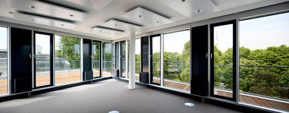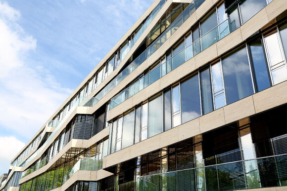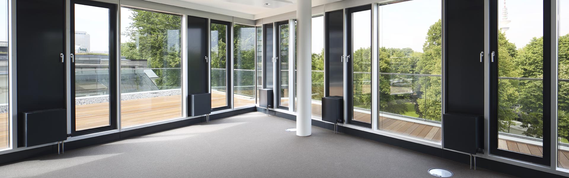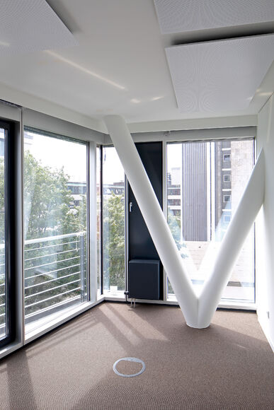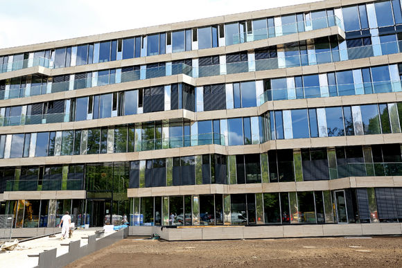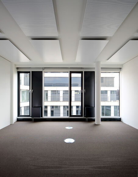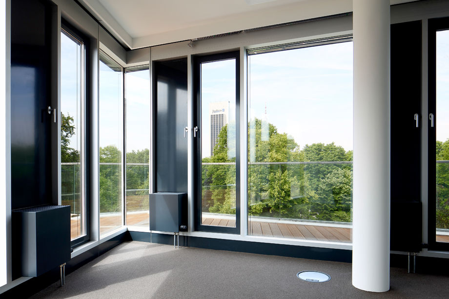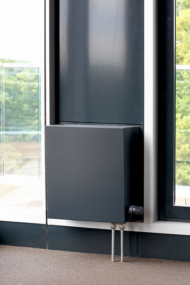 Für das Bürogebäude mit insgesamt 13.200 m2 Mietfläche wurde hinsichtlich der Abmessungen von PowerKon + W eine schmale Sonderkonstruktion für den Nischeneinbau entwickelt. Eine weitere Besonderheit sind die Anschlüsse für Vor- und Rücklauf von unten über einen Hahnblock. Als Zubehör lieferte Kampmann Konvektor-Anschlussgarnituren (Ventilunterteile, absperrbare Rücklaufverschraubungen) und Thermostatköpfe. Darüber hinaus wurden zur Befestigung an der Fassade spezielle Wandhalter mit passgenauen Lochbohrungen gefertigt.