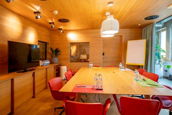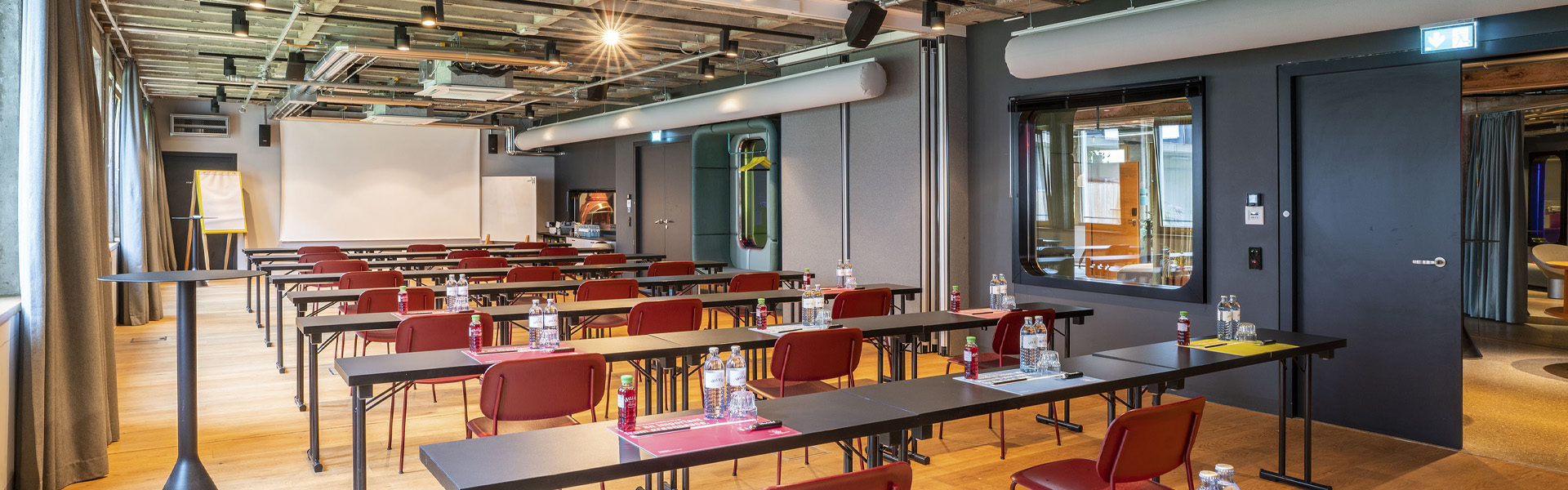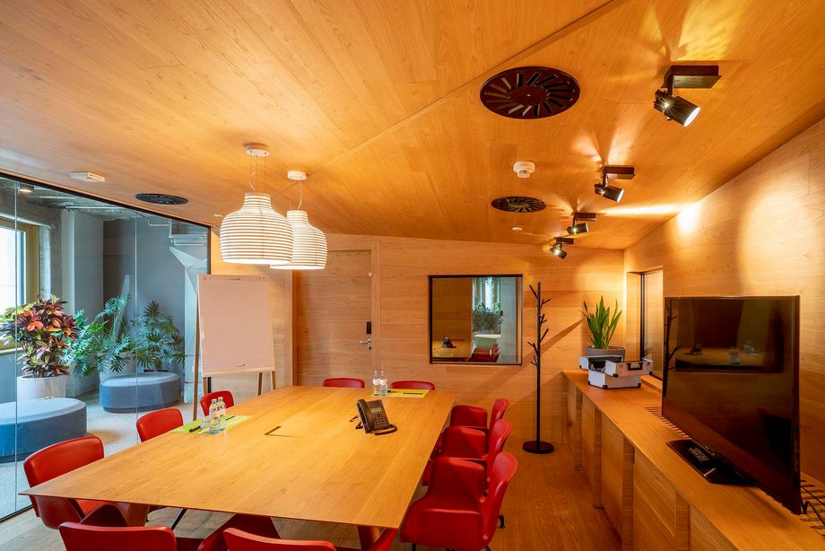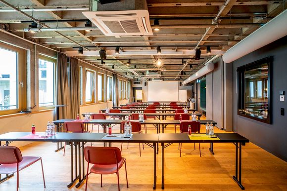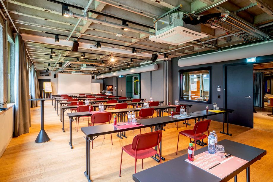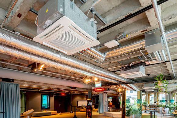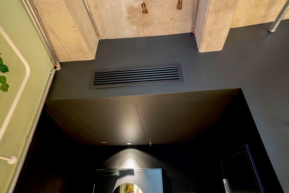 In öffentlichen Bereichen wie dem Seminarraum sorgen KaCool D für die Klimatisierung. Die Deckenkassetten zum Heizen und Kühlen bringen die Luft dank der seitlichen Luftauslässe besonders behaglich in die Räume ein. Anders als üblich sind die KaCool D im The Circle nicht in eine Zwischendecke integriert, sondern sind unverkleidet in Sichtmontage unter der Decke installiert und werden so zum Designelement.