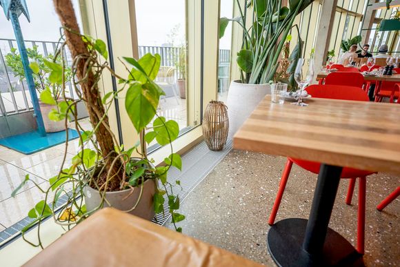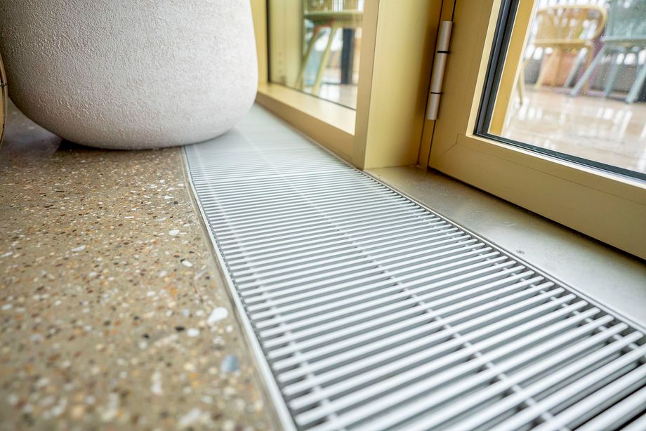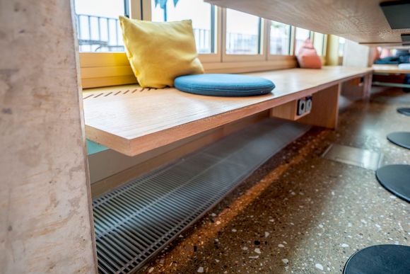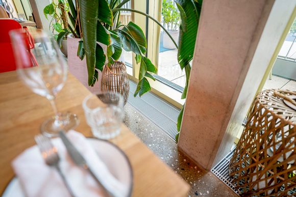 Schlußendlich sind noch in der ausgezeichneten Hotelbar und im Restaurant vor den bodentiefen Fenstern Katherm NK eingebaut – leistungsorientierte Unterflurkonvektoren mit natürlicher Konvektion. Die hohe Wärmeleistung des Konvektors wurde verbindlich nach der DIN EN 16430 gemessen und bestätigt. Gleichzeitig ist der Katherm NK besonders für den energiesparenden Niedertemperaturbetrieb geeignet. Da das Circle seinem Namen Ehre macht, sind die Katherm NK polygonal ausgeführt, passen sich also der runden Gebäudeform an. Roll-Roste aus eloxiertem Aluminium fügen sich harmonisch in das Gestaltungskonzept.