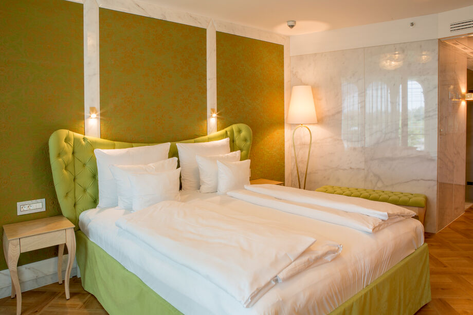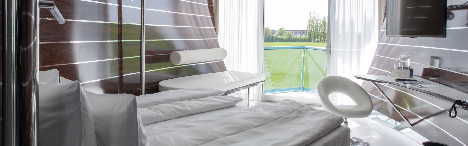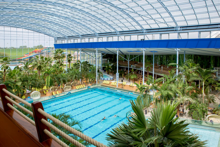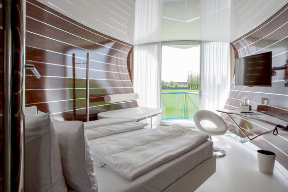 29 Wasserbecken, 26 Rutschen 30 Saunen, 450 echte Großpalmen und mehr als 4000 Liegen auf 185 Hektar Fläche – seit der Eröffnung in 1999 hat sich die Therme Erding zur größten Thermenwelt Europas entwickelt. An manchen Tagen zählt das Freizeitbad über 10.000 Besucher. Der Anbau eines Hotels war vor diesem Hintergrund absolut folgerichtig.