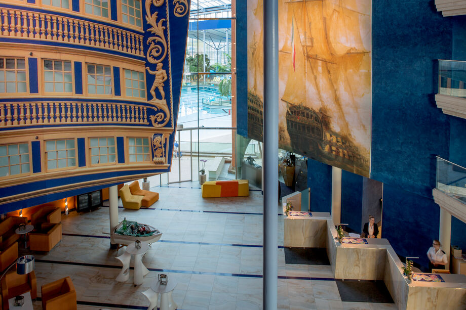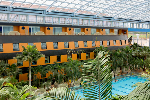 Das Hotel Victory hat die Form eines Schiffsrumpfes, welcher der HMS Victory nachempfunden ist; jenem Schiff, mit dem der legendäre Lord Nelson den Feinden der Krone einst das Fürchten lehrte. Parallel zum Hotel ist ein 9.000 Quadratmeter großes, von Palmen umsäumtes Wellenbad entstanden, dass die maritime Atmosphäre perfekt macht.