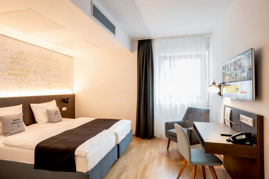 Teil des Wohlfühlklimas ist eine kontrollierte Frischluftzufuhr in den Zimmern. Diese sorgt nicht nur für unverbrauchte, angenehme Luft, sondern auch dafür, dass die Luft hygienisch rein ist. Das JUFA setzt hier auf das dezentrale Lüftungssystem FZAS von Kampmann. Die Außenluftversorgung erfolgt direkt über die Fassade, sodass auf platzraubende Versorgungsschächte verzichtet werden kann. Der FZAS kann zudem heizen und kühlen und vom Gast individuell auf sein Wunschklima eingestellt werden. 210 FZAS sind im JUFA Hotel Hamburg HafenCity installiert und somit die entscheidende Klimakomponente in den Zimmern.