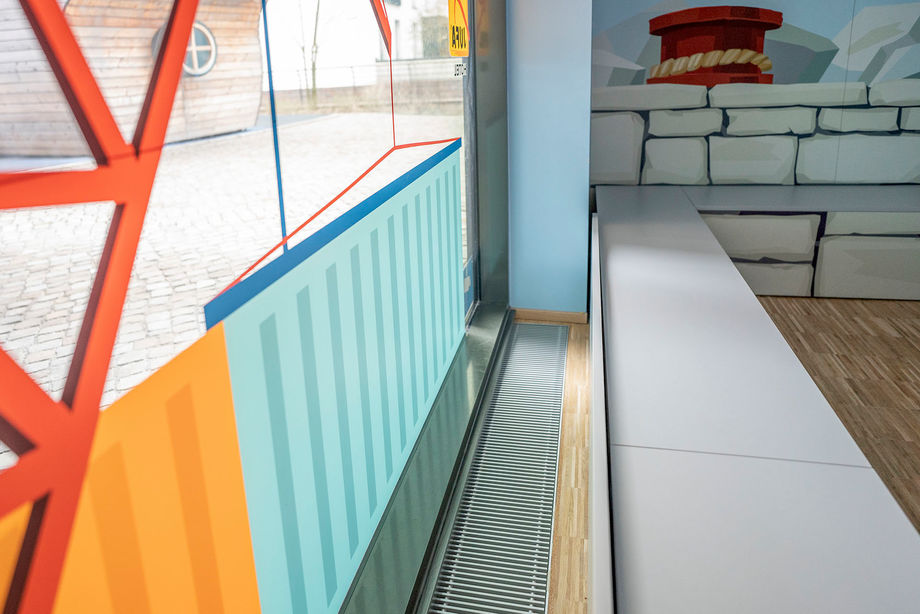 Nicht unerwähnt bleiben sollen die Installation eines Unterflurkonvektors Katherm QK, der im Indoor-Spielbereich den Raum vor Kaltlufteinfall schützt sowie die Bauheizer, die in der kalten Jahreszeit witterungsbedingte Baustopps verhinderten und somit zur pünktlichen Eröffnung beitrugen.
