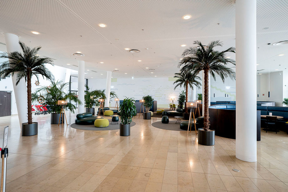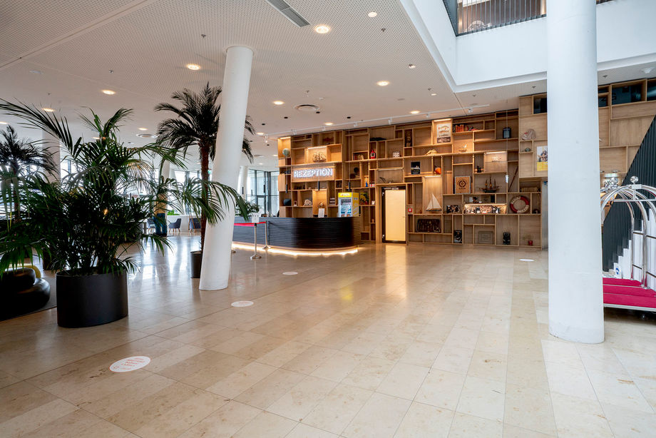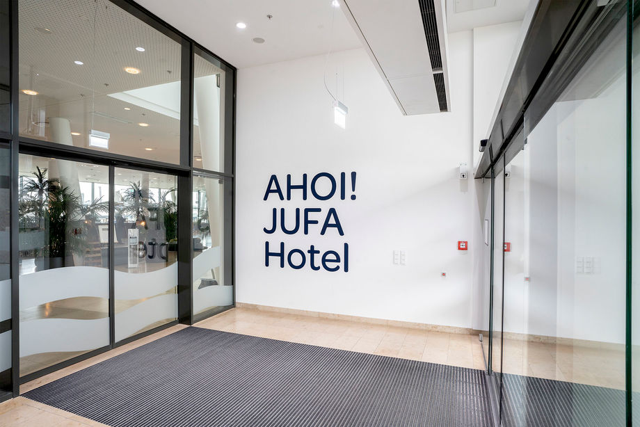 Mit einem freundlich-fröhlichen AHOI! und einem angenehmen Luftschleier begrüßt das JUFA Hotel Hamburg HafenCity im Windfang des Einganges seine Gäste, bevor man die großzügige Lobby betritt, die mit zahlreichen ebenso gemütlichen wie designorientierten Loungemöbeln aufwartet. Das „AHOI!“ zahlt darauf ein, dass man sich hier direkt am Hamburger Baakenhafen befindet. Und der Kampmann Luftschleier gewährleistet, dass die kühle Meeresluft, die gerne mal die Elbe heraufweht, draußen bleibt.