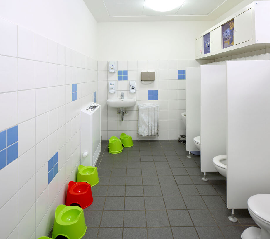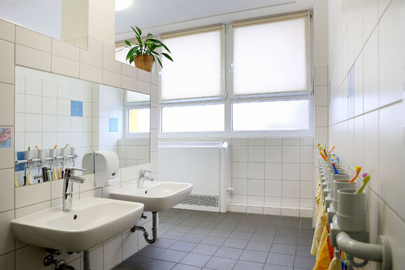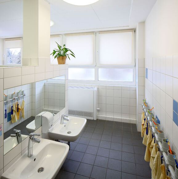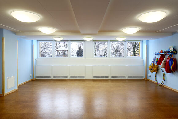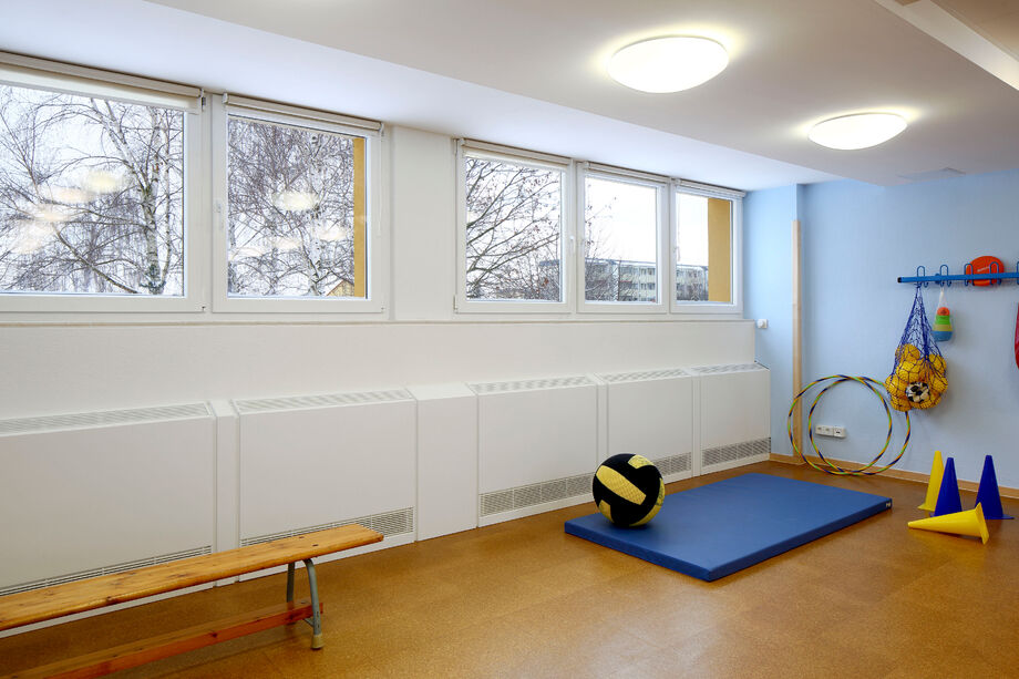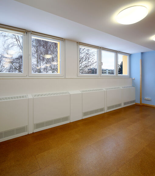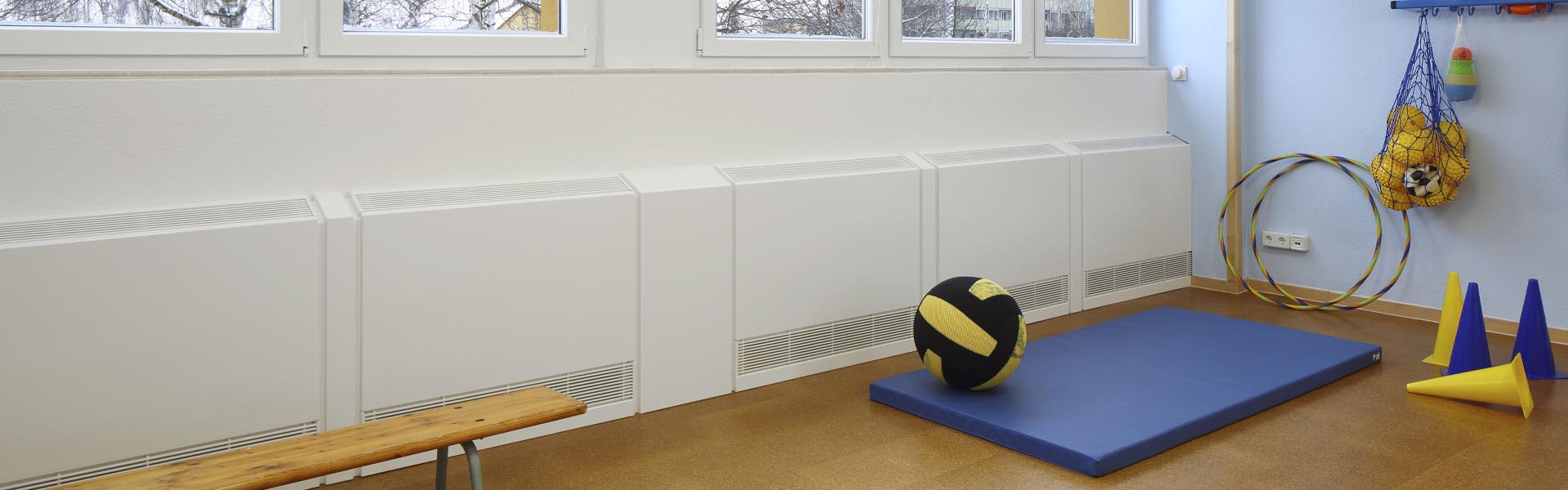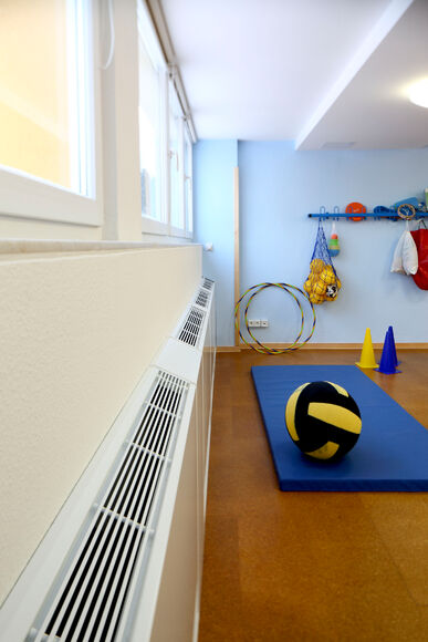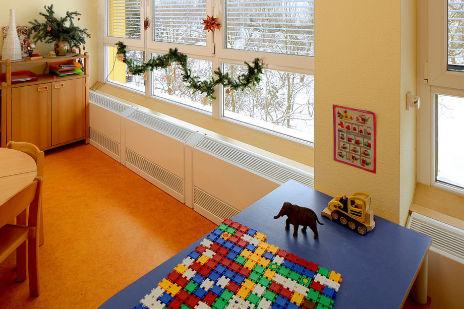 Bei den speziell für die Kindertagesstätte gefertigten Komfortverkleidungen wurde ein besonderes Augenmerk auf die Bedürfnisse der Kinder gelegt. Weder scharfe Stahlkanten noch ein Direktkontakt mit den Konvektoren gefährden die Kleinen.