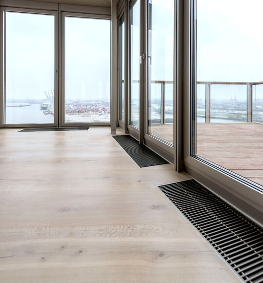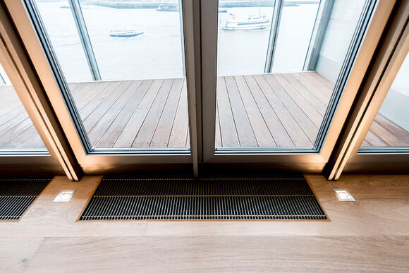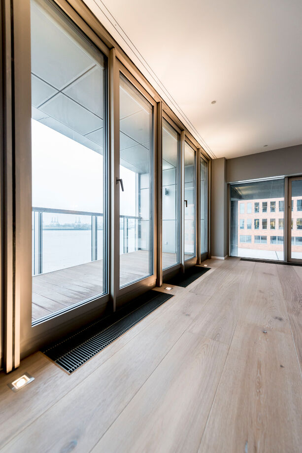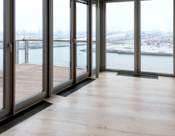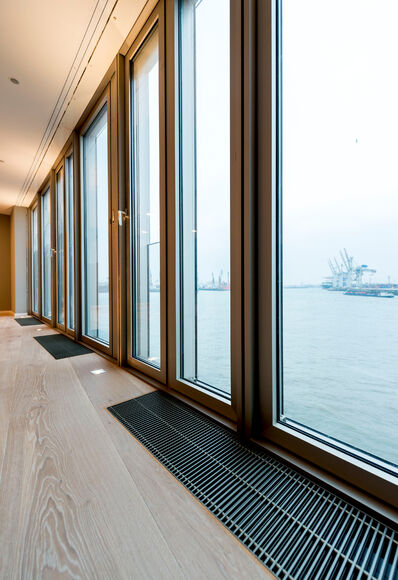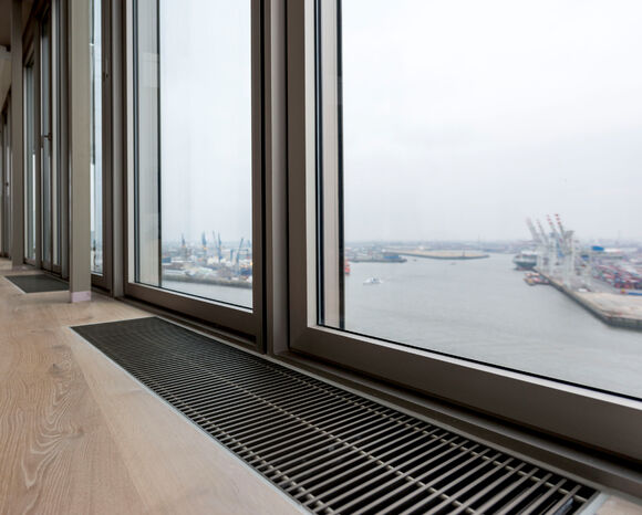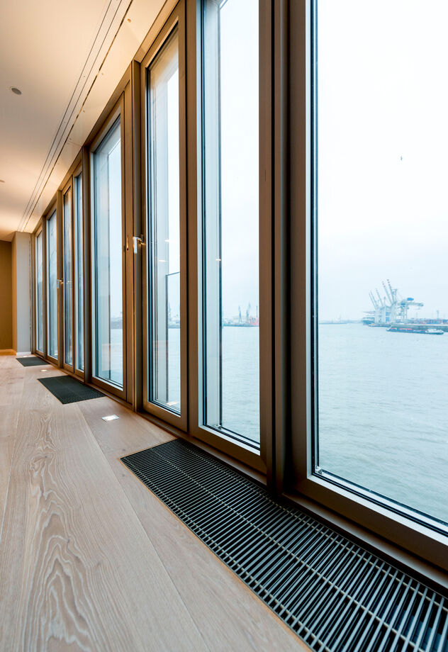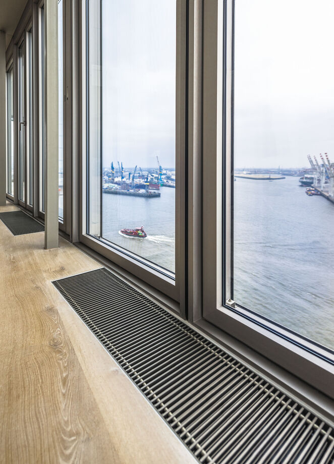 Dezentrales Raumklima aus dem Boden ermöglicht einen freien Blick auf das atemberaubende Panorama des Holzhafens, dem ältesten noch erhaltenen Hafenbecken Hamburgs.