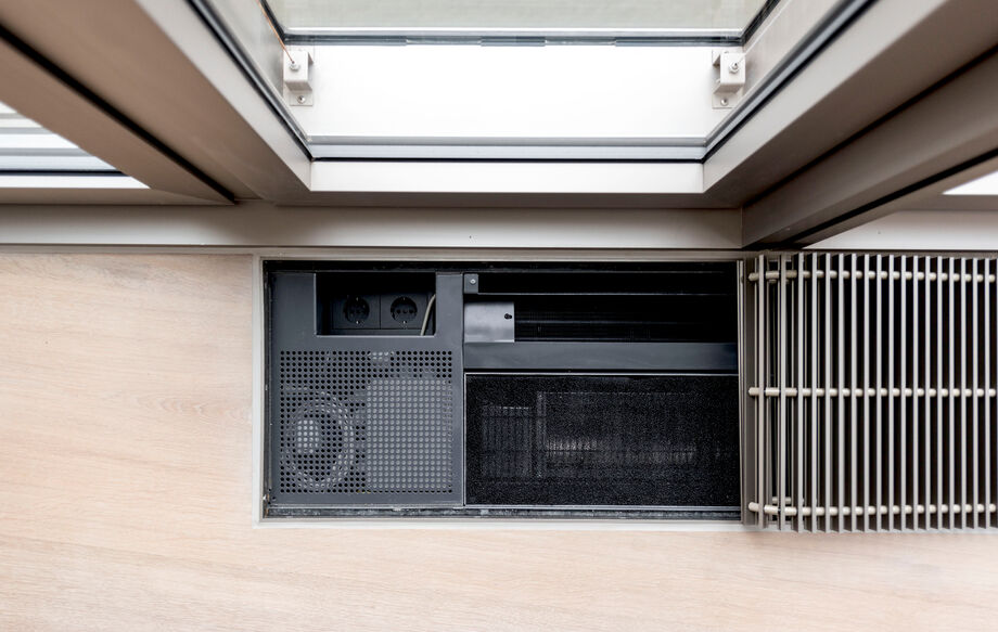 SlimKon verhindert Kaltluftabfall und unangenehme Zugerscheinungen an großen und übergeschosshohen Fensterfronten. Das Fassadenheizsystem fügt sich unauffällig an die Fassade: Dank Sonderbauweise mit integrierter Rohrführung und mit angepasstem Sonderfarbton (eloxiert).