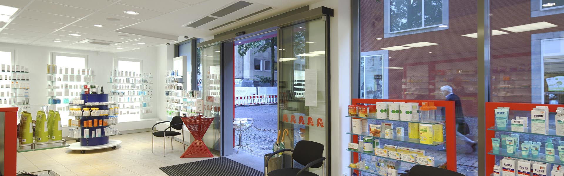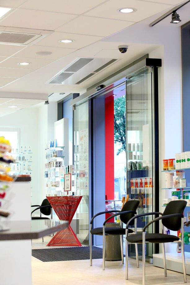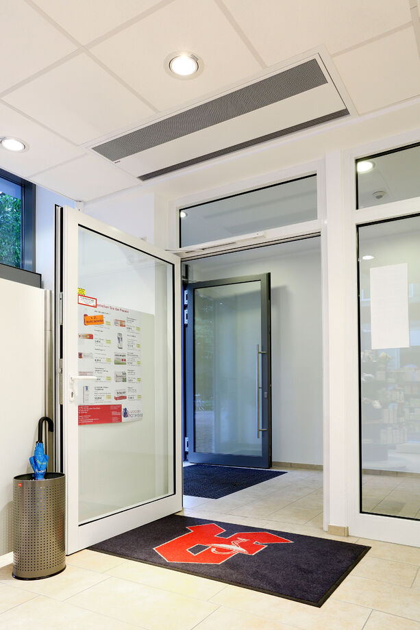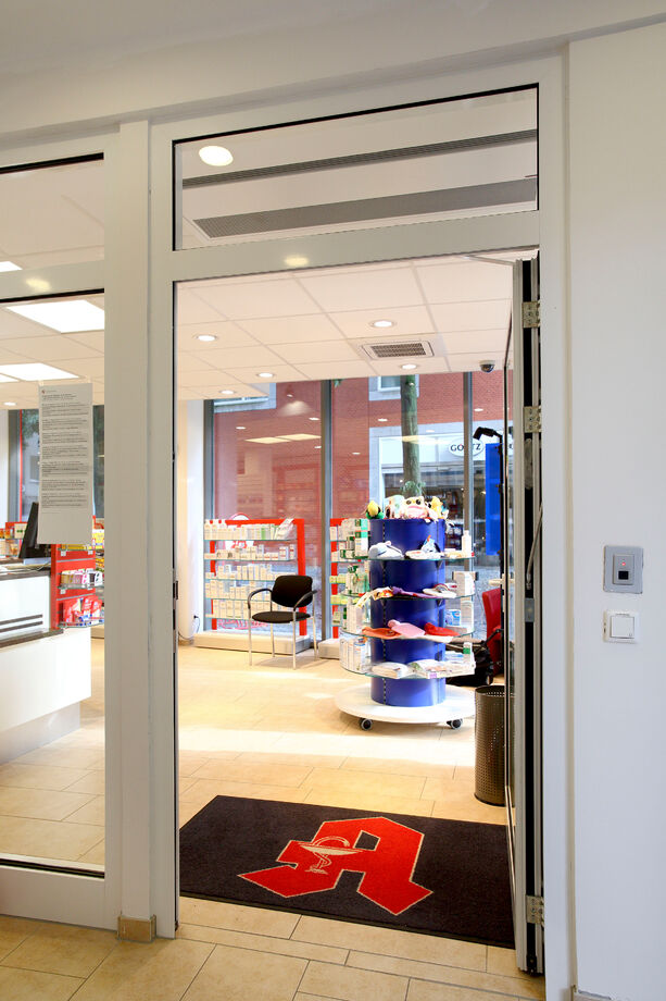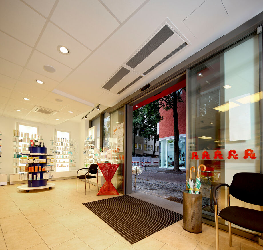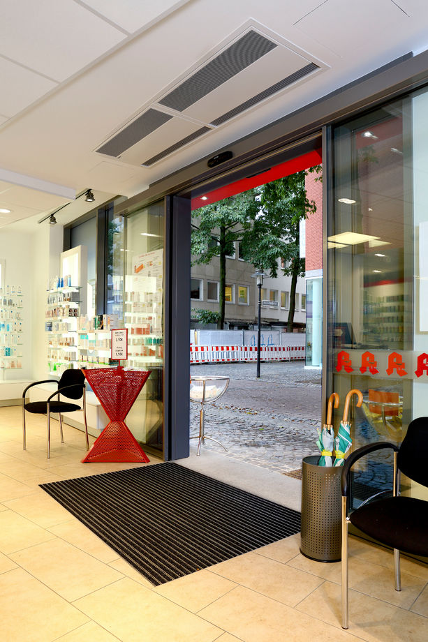 Die Apotheke kann ihre Kundschaft in zentraler Innenstadtlage mit offenen Türen begrüßen, während Kassetten-UniLine Türluftschleier effektiv Energieverluste senken. Die Geräte schützen im Winter vor Kaltlufteinfall und reduzieren im Sommer eindringende Warmluft.