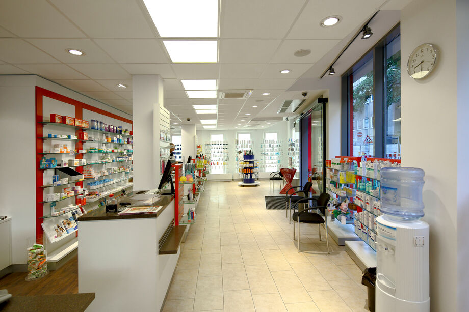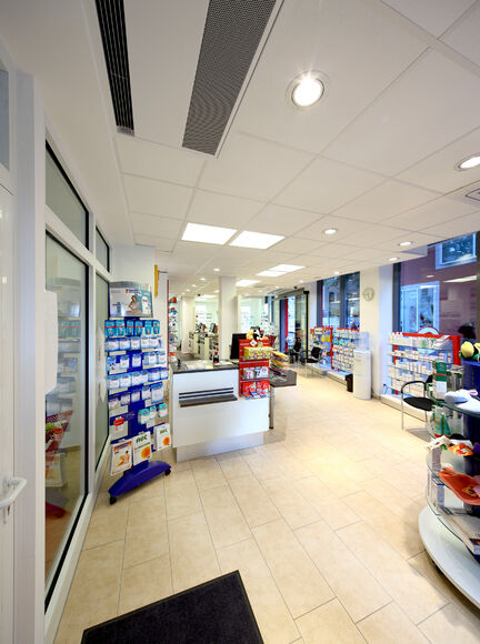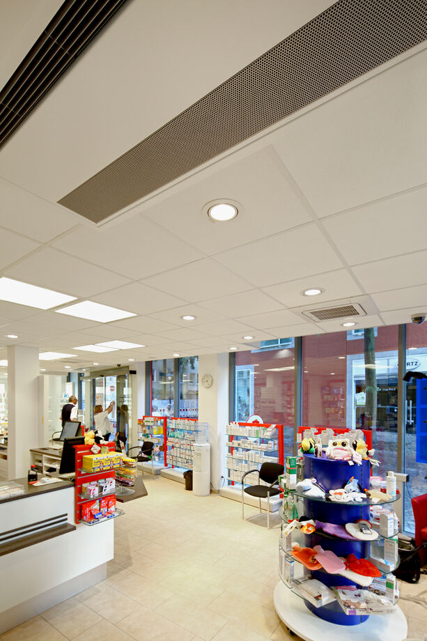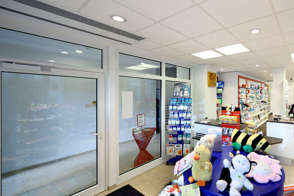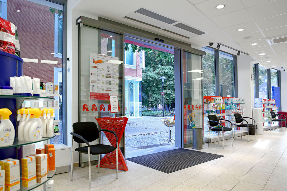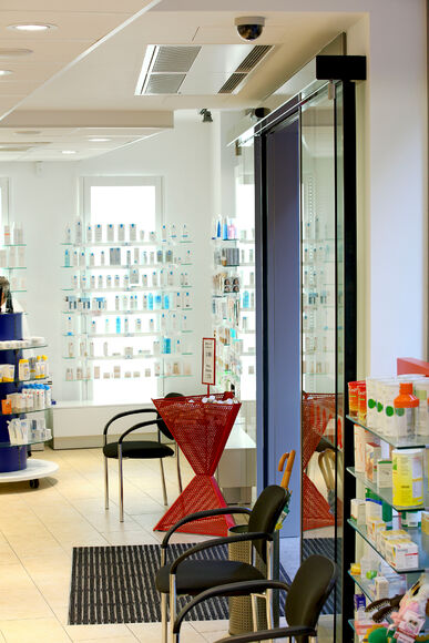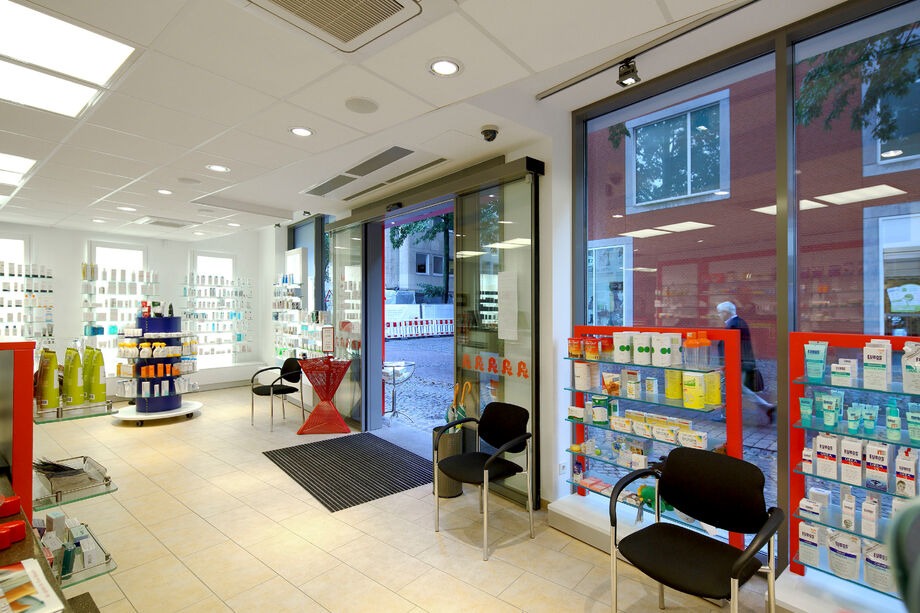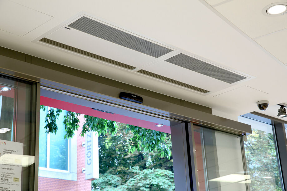 Die Apotheke kann ihre Kundschaft in zentraler Innenstadtlage mit offenen Türen begrüßen, während Kassetten-UniLine Türluftschleier effektiv Energieverluste senken. Die Geräte schützen im Winter vor Kaltlufteinfall und reduzieren im Sommer eindringende Warmluft.