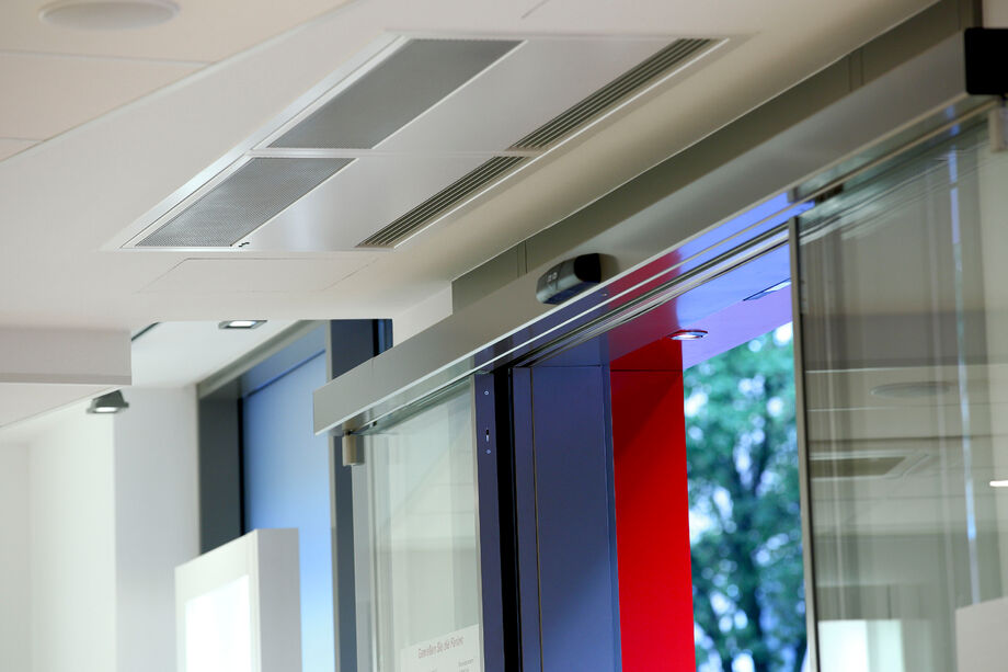 An zwei Eingängen – zur Fußgängerzone und zum Eingangsbereich des Ärztehauses – sorgen die Kassetten-UniLine Türluftschleier in verschiedenen Baugrößen durch die Kaltluftabschirmung für ein komfortables Wohlfühlklima.