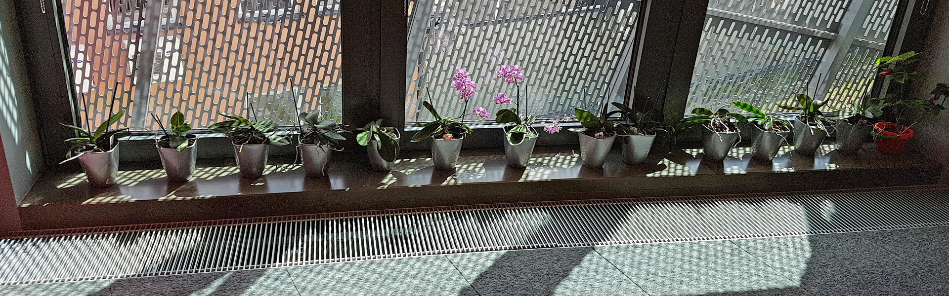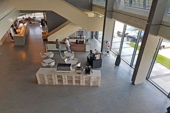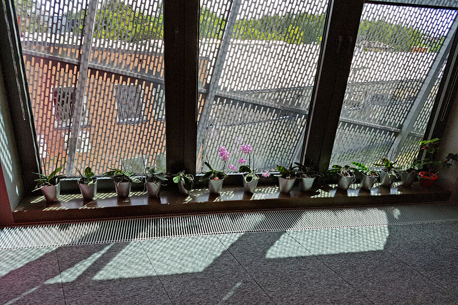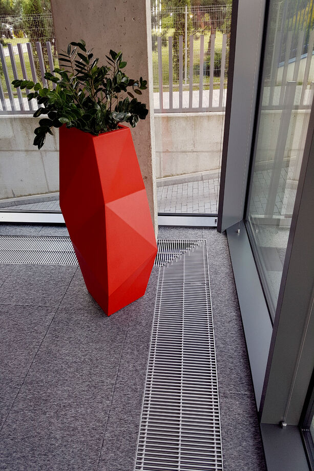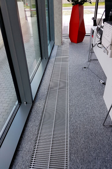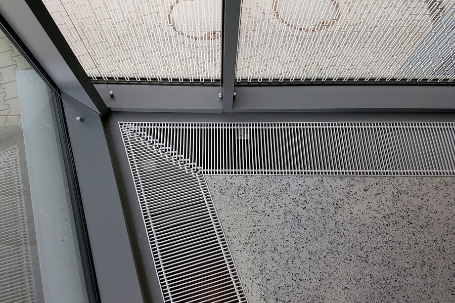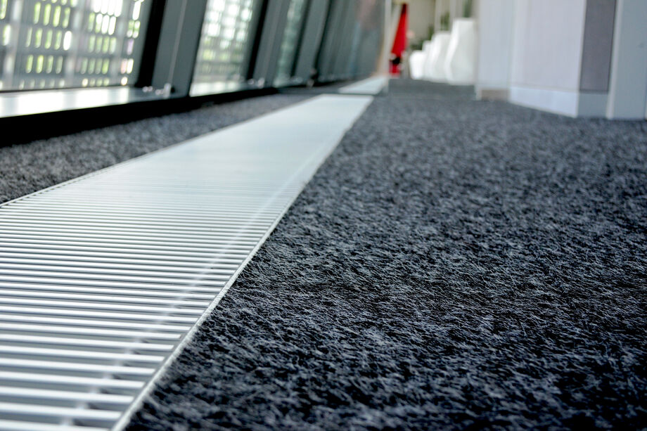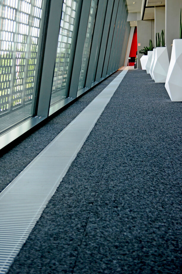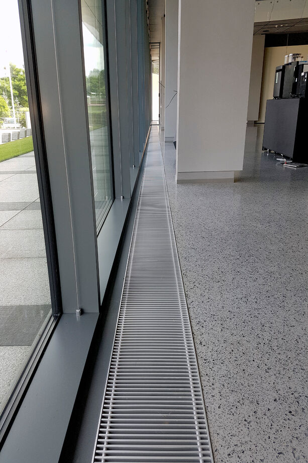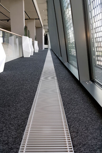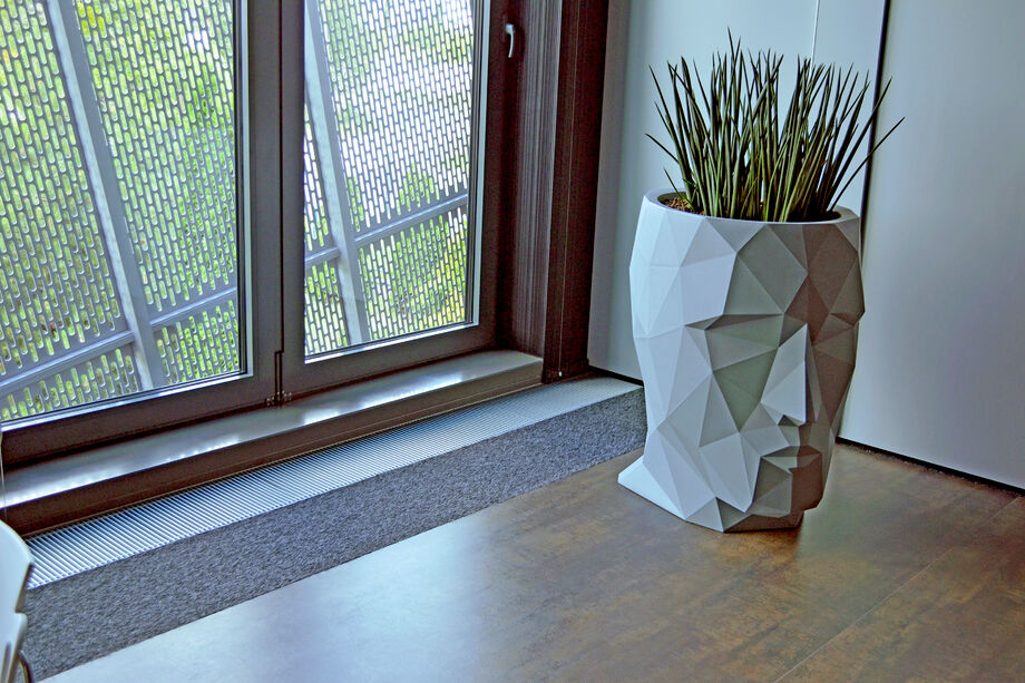 Heizen und kühlen – vor den bodentiefen Fenstern der Eingangslounge sind Katherm HK installiert: Bodenkanalheizungen zum Heizen und Kühlen. Der repräsentative, großzügige Raum ist mit kubistisch anmutenden Vasen und Designmöbeln ausgestattet. Ein Ambiente, in dem sich sie Katherm vornehm zurücknehmen. Dezent, marktführend leise, aber leistungsstark und effizient mit EC-Motoren versehen, sorgen die Bodenkanalheizungen hier für ein optimales Klima. Ergänzt werden sie durch Katherm NK mit natürlicher Konvektion.