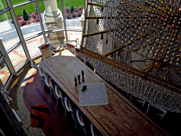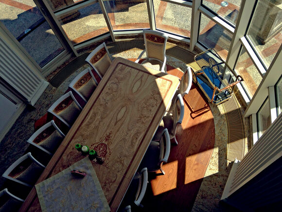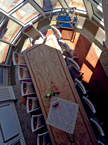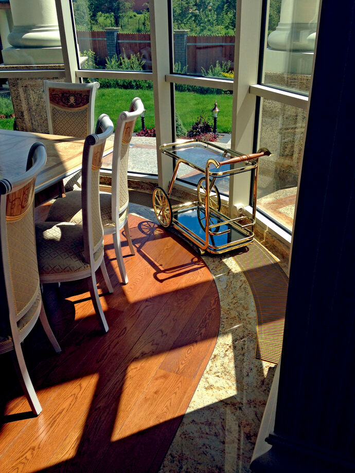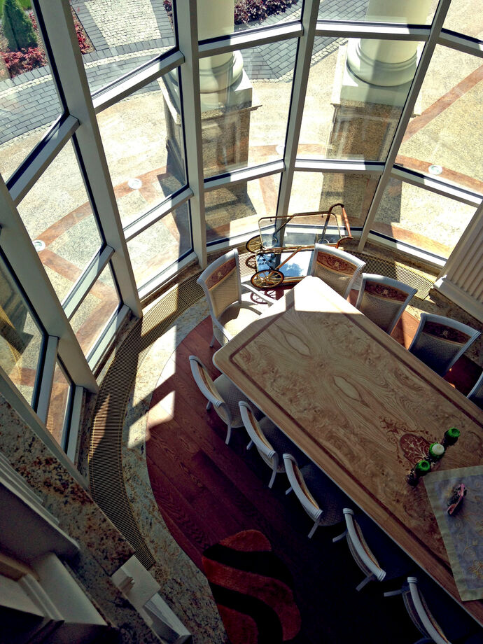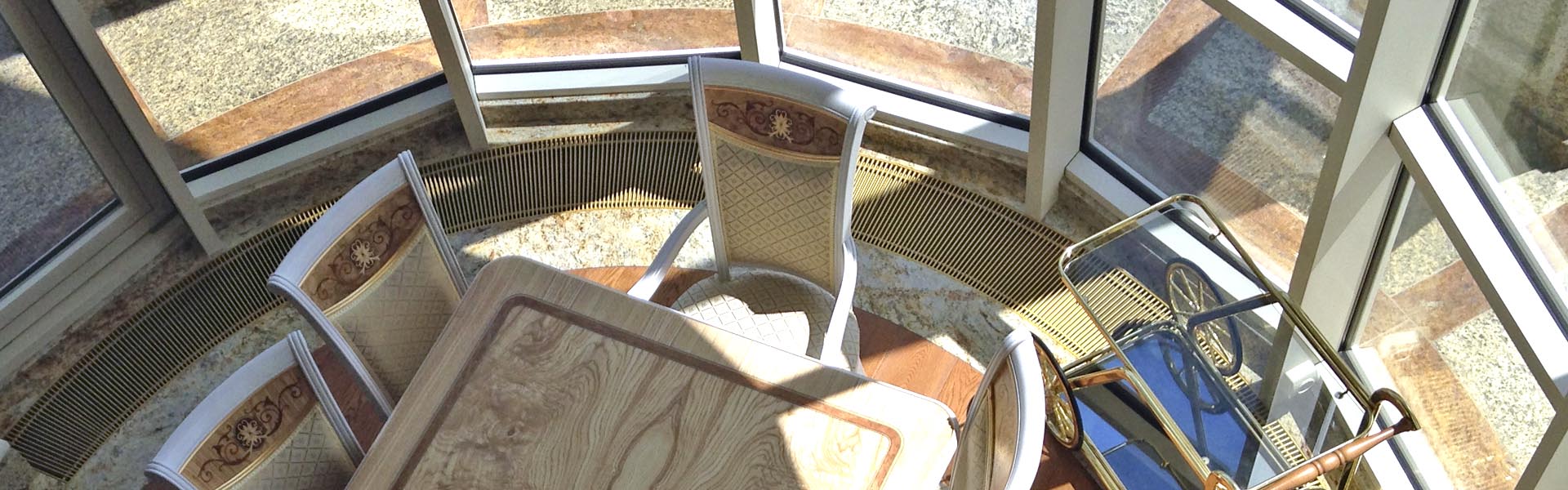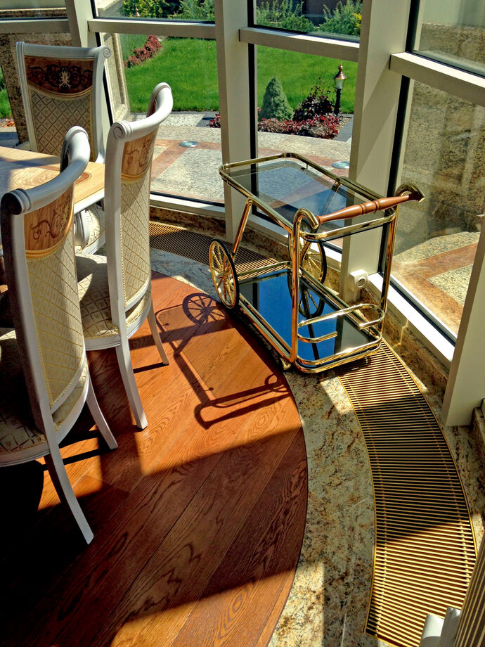 Die warme Farbgebung der Roll-Roste in Aluminium messing eloxiert sorgt zusammen mit dem Marmor des Wintergartens für ein exklusives Wohlfühlklima.