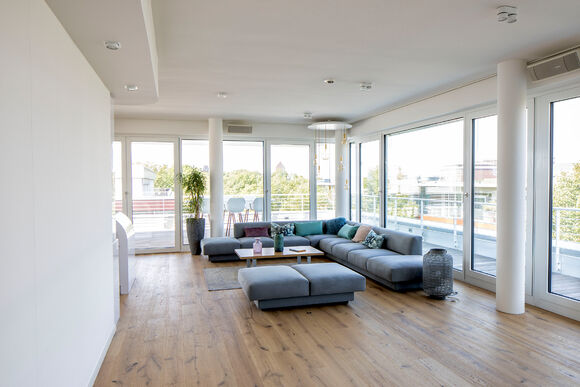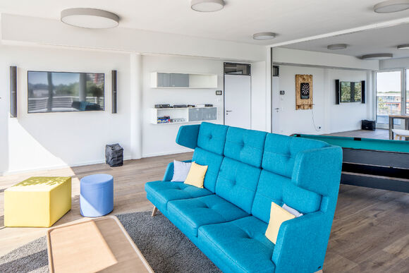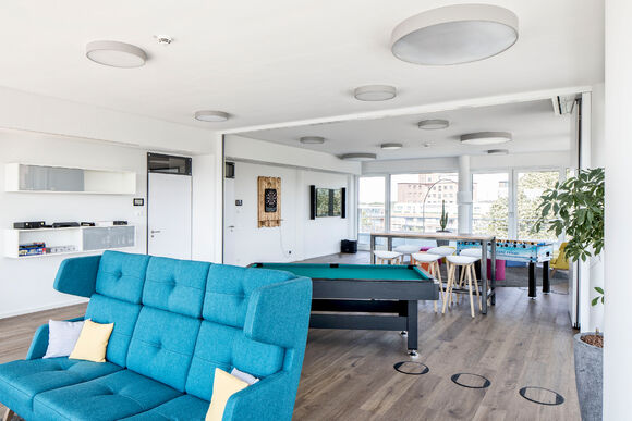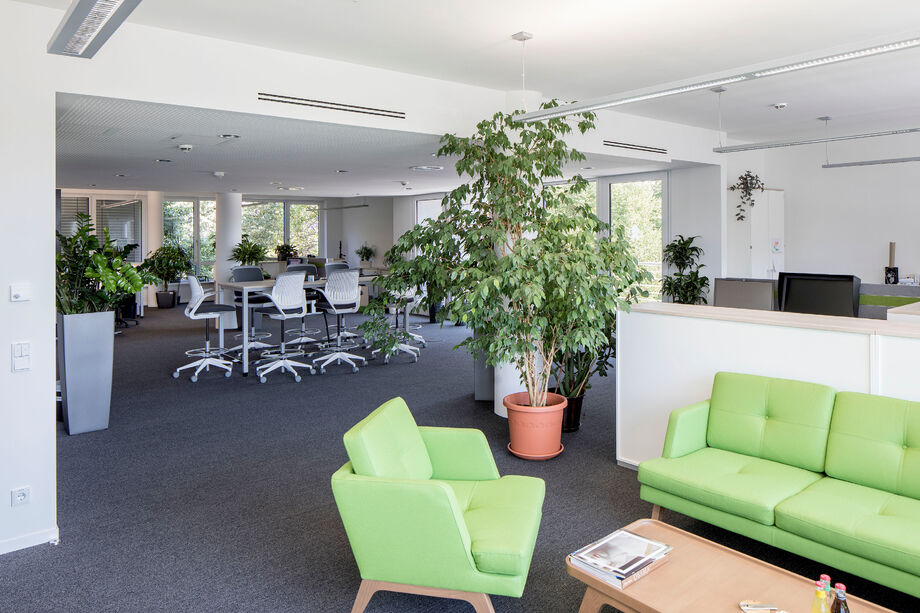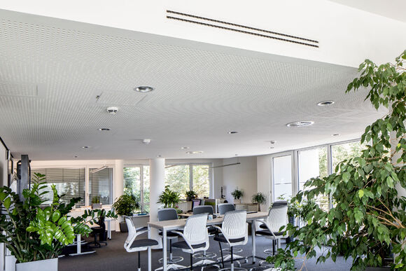 Lichtdurchflutete Räume, helle Büros, ein Wasserfall, viele Pflanzen sowie stylische Ruhe- und Freizeiträume samt Tischkicker machen aus dem Neubau eine Arbeitswelt, wie man sie sich nur wünschen kann. Passend zum Betriebsklima ist auch das Raumklima hervorragend: Die Zu- und Abluft wird über Kampmann Kombi- und Schlitzluftdurchlässe organisiert.