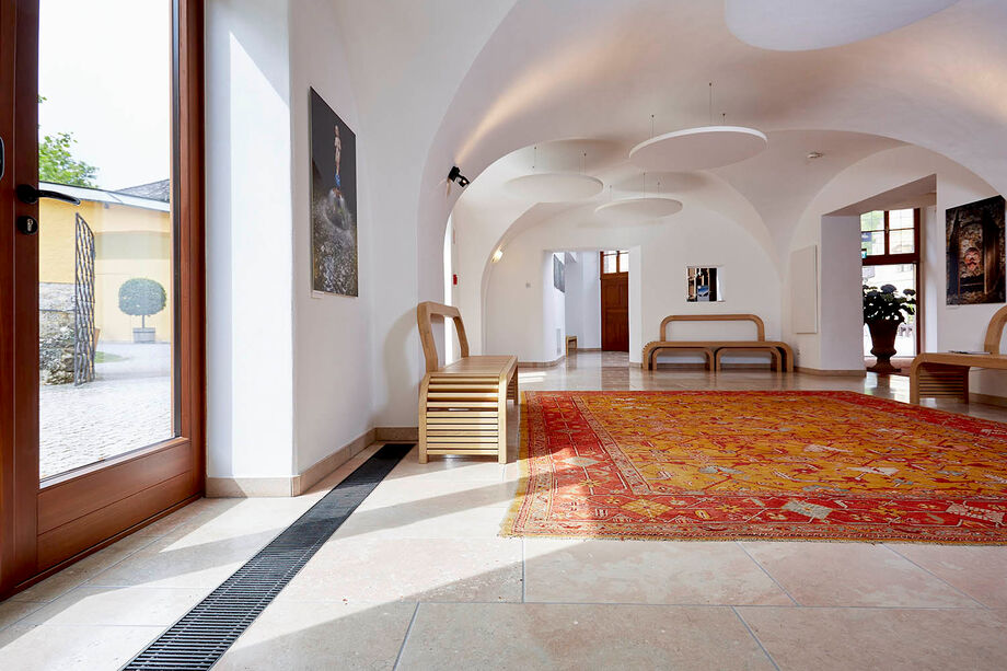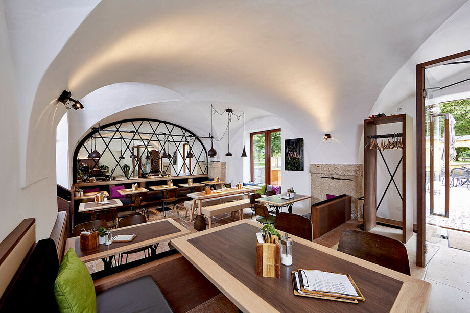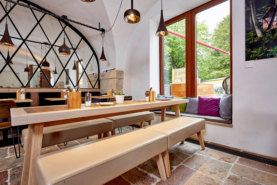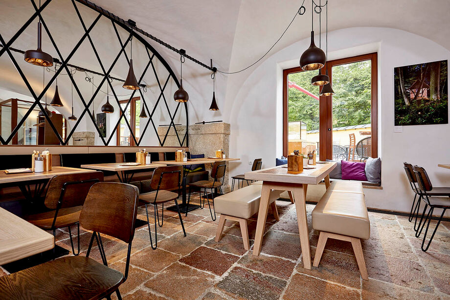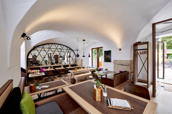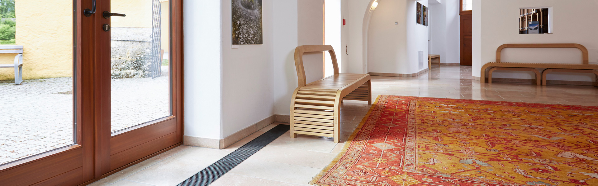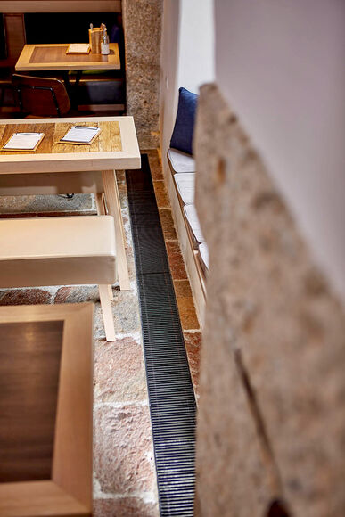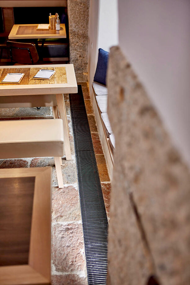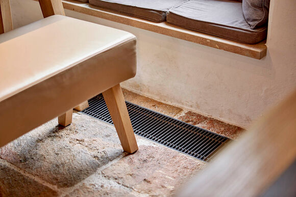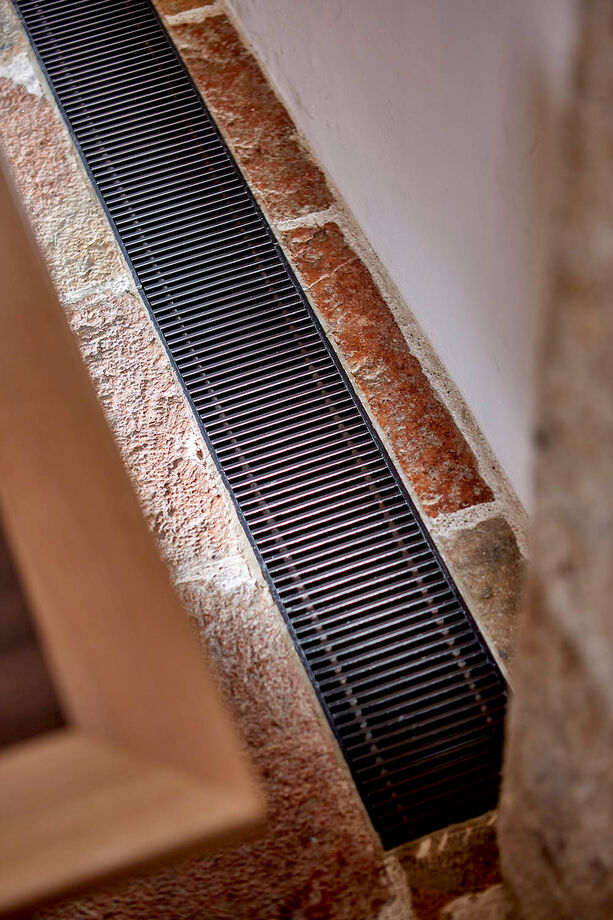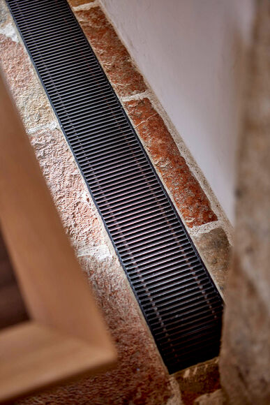 Im Schloss Hellbrunn sorgen die Konvektoren vor den großen Fensterflächen im neuen Gastrobereich und im Aufenthaltraum für eine effektive Kaltluftabschirmung. Dabei passen die bronze eloxierten Roste wunderbar zur rustikalen Inneneinrichtung.