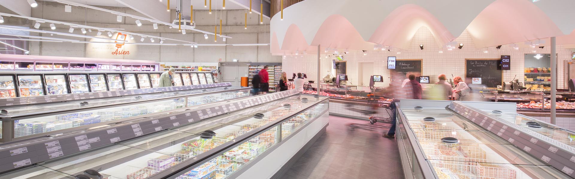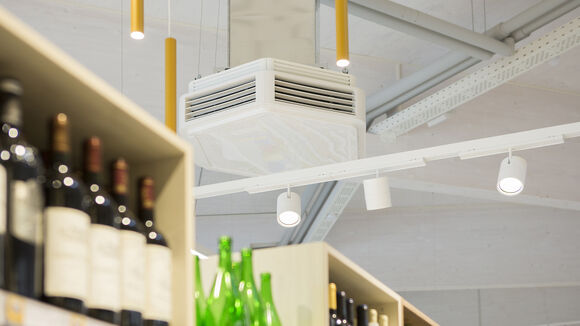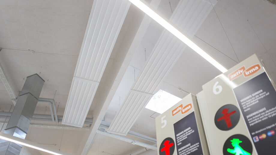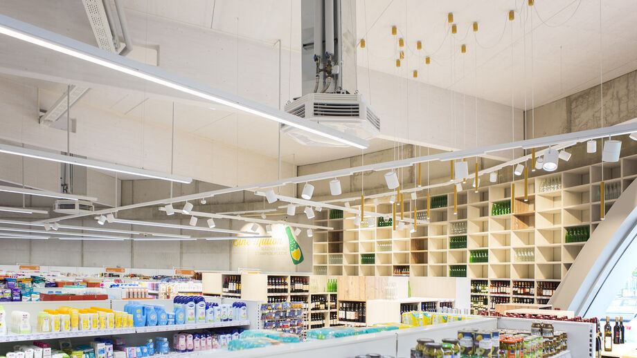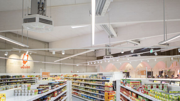 Als Sekundärluft-Geräte fungieren im Rauminnern Ultra Deckengeräte; echte Kampmann-Klassiker für exklusive Großräume, so wie der aktiv & irma Markt zweifelsfrei einer ist. Galaxis Deckenstrahlplatten ergänzen das Konzept im Verkaufsraum, während im Lagerbereich die grundsoliden, äußerst wirtschaftlichen TOP Lufterhitzer ihren Dienst erledigen. Schlussendlich sind da noch die Diafort Dachventilatoren, die bei einem Kältemittelalarm der Ein-Richtung-Lüftungsanlage für die Entüftung des Lagers verantwortlich sind.