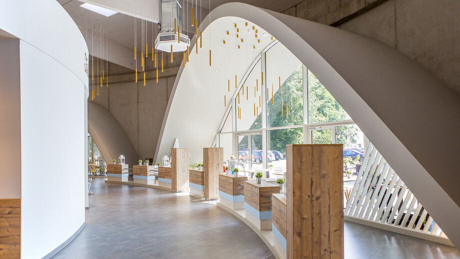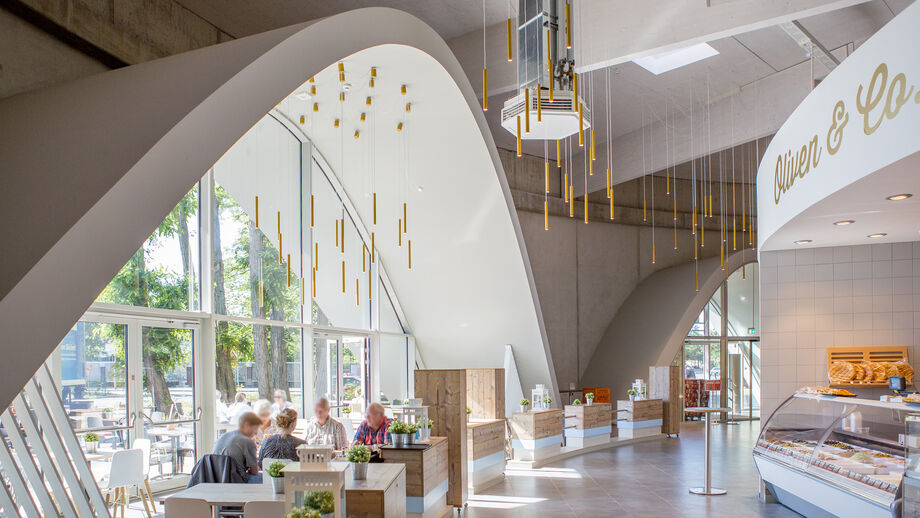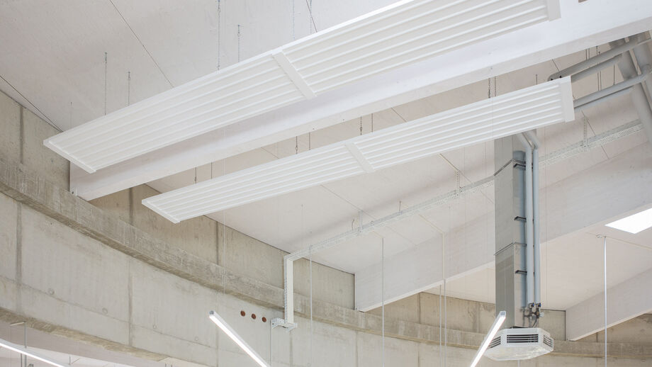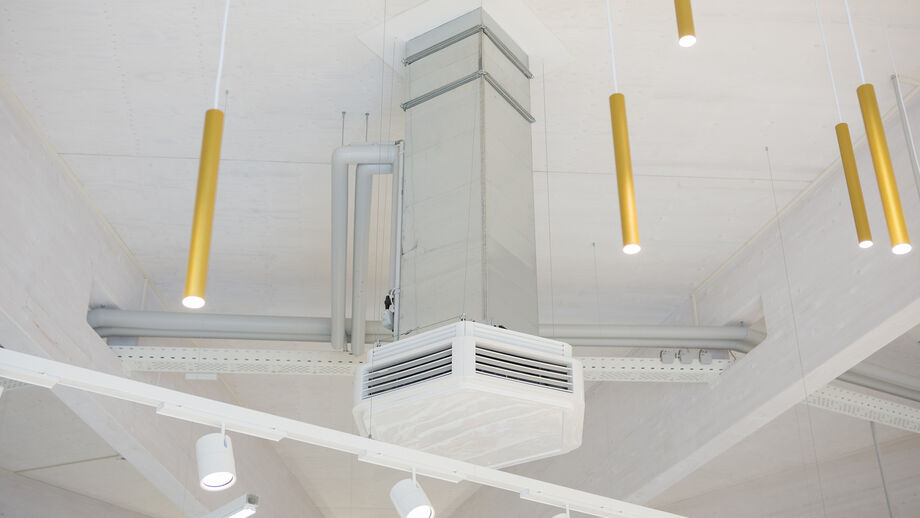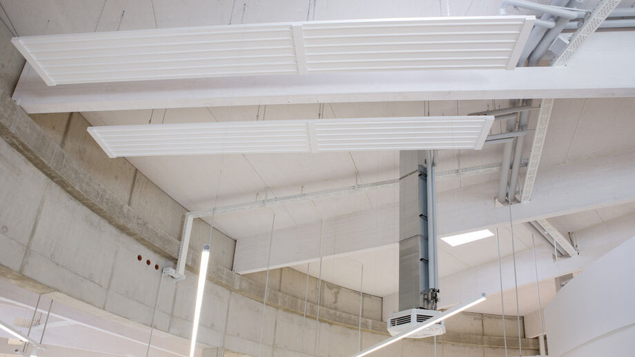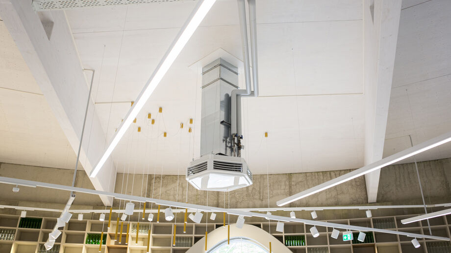 Auf jedem der drei Gebäudekreise ist ein RLT-Gerät von Kampmann installiert. Sie sind exakt auf die jeweilig zu konditionierenden Luftvolumina angepasst: Die Luftvolumenströme betragen für Zone 1 4.200 m³/h, für Zone 2 8.800 m³/h und für Zone 3 4.900 m³/h. Bei den Zonen 1 und 2 sind die RLT-Geräte Bestandteil von Kampmanns Hybrid ECO System. Hierbei dient das RLT-Gerät rein zur Lüftung und Wärmerückgewinnung. Die (gegebenenfalls vorkonditionierte) Luft wird über ein Kanalsystem zu den im Raum befindlichen Sekundärluft-Geräten geführt, welche die Frischluft aufnehmen und final erwärmen beziehungsweise kühlen. Diese ErP-konforme Lösung ist nicht nur maximal effizient, weil das RLT-Gerät nur bei Frischluftbedarf läuft; es spart auch Platz und damit Baukosten.