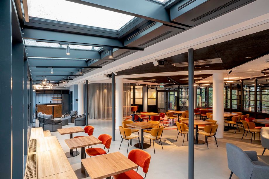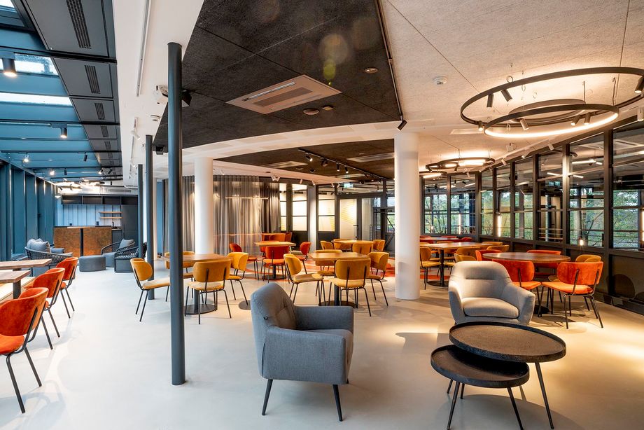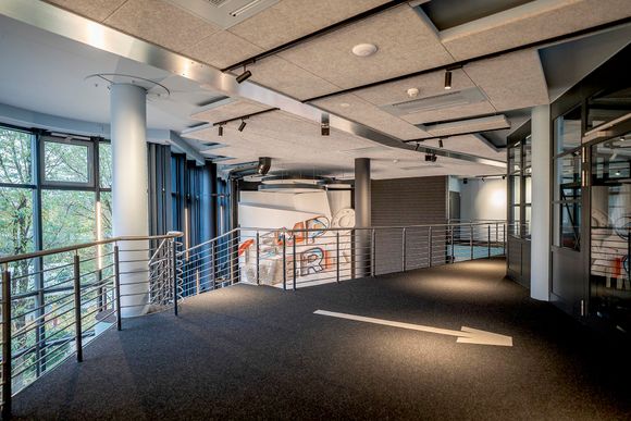 Im Innern dann Kampmann Fan Coils wohin das Auge blickt: Alleine etwa 200 Deckenkassetten sind im Tempowerk in den Büro- und Hotelzimmerbereichen installiert und zudem regelungstechnisch in eine übergeordnete GLT eingebunden. Die Fan Coils sind sowohl in die abgehängte Rasterdecke integriert wie auch unverkleidet unter der Betondecke der Lounge, sodass der industrielle Charakter erhalten blieb. Die Deckenkassetten heizen und kühlen dank seitlicher Luftdurchlässe besonders behaglich.