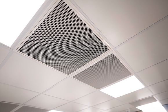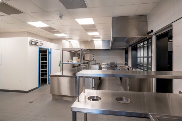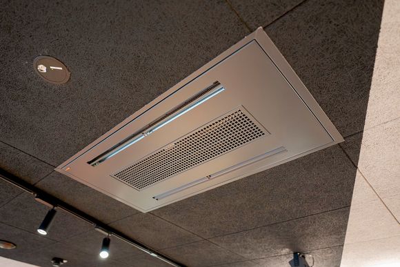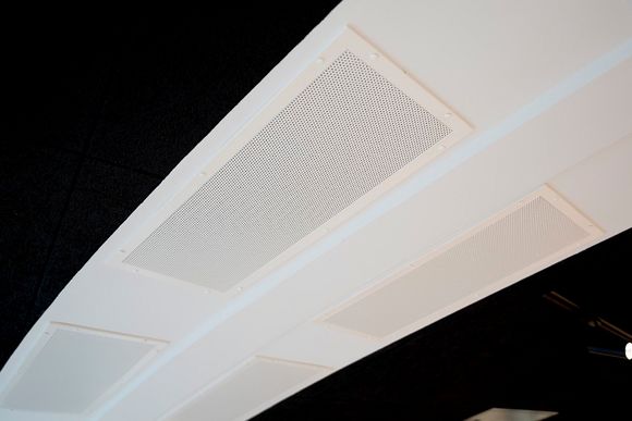 Für die Versorgung des Küchenbereichs mit Frischluft sind multifunktionale Deckenluftdurchlässe vom Typ MPC-Q von Kampmann in der Zwischendecke verbaut. Hinter der schlichten, perforierten Frontplatte steckt ein modulares System, das verschiedene Arten der Lufteinbringung ermöglicht: Von Quelllüftung über eine radiale Lufteinbringung bis hin zu einem variablen vierseitigen Luftaustritt. Der MPC lässt sich durch seine klappbare Front einfach gemäß der VDI 6022 reinigen.