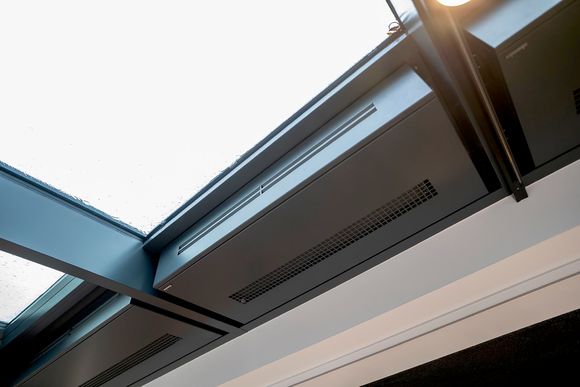 Ähnliches gilt für den KaDeck. 20 dieser dezent-formschönen Fan Coils sind im Tempowerk im Betrieb. Einige davon verkleidet in grauer Projektausführung und mit einseitigem Luftausblas. In einigen Bereichen wurde der KaDeck in Bauart und Design projektspezifisch so konstruiert, dass er exakt in die Nischen passt. Die Fan Coils fügen sich so harmonisch in die Raumarchitektur ein. Der Kadeck ist besonders leise und höchst effizient. Weitere Pluspunkte sind die geringe Aufbauhöhe von nur 160 Millimetern und das fortschrittliche Revisionskonzept, bei dem die Wartung komplett durch den Gerätedeckel durchgeführt werden kann.