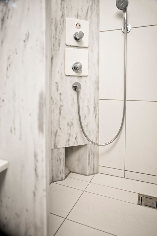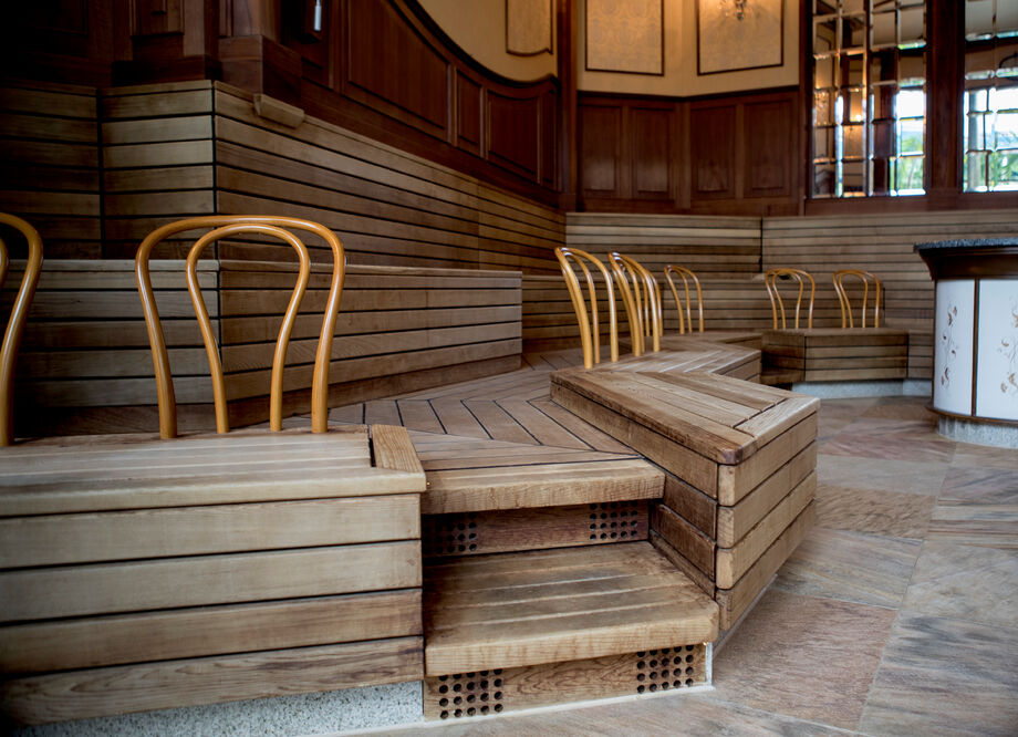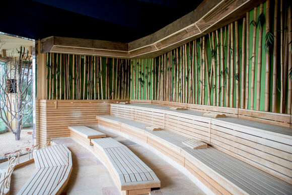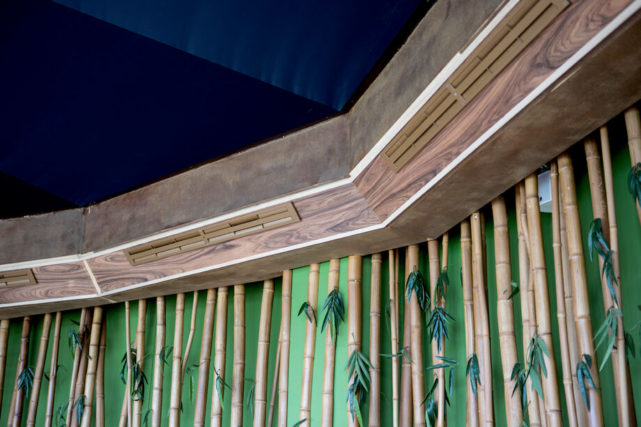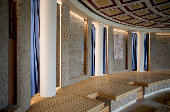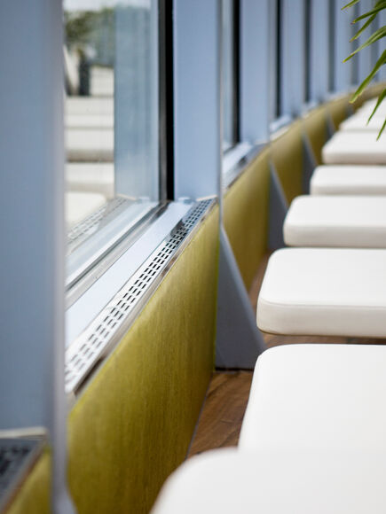 Diese effizient aufbereiteten großen Luftmengen werden dem Bad besonders smart zugeführt: Unter der Empore der Sonnenliegen, als Schattenfuge, aus den Palmenkübeln, in die Bänke der Bademantel-Garderobe integriert – die Luft strömt in Euskirchen aus den unwahrscheinlichsten Quellen. Selbst die Sauna wird über RLT-Geräte von NOVA beheizt.